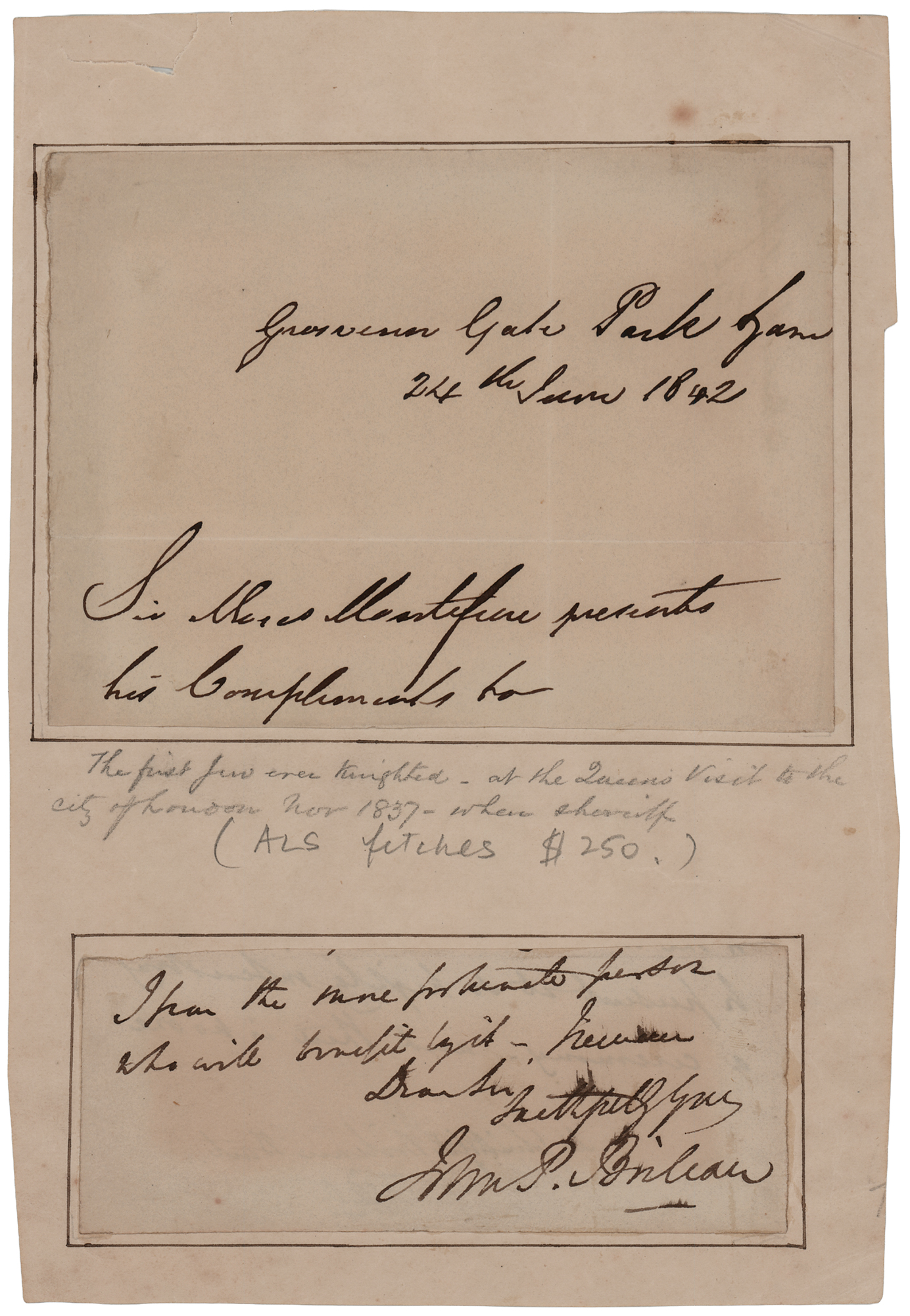 Financier, banker, philanthropist, and Sheriff of London (1784-1885), who donated large sums of money to promote industry business, economic development, education, and health among the Jewish community in Levant. Ink signature, "Sir Moses Montefiore presents his Compliments,” on an off-white 5 x 3.75 sheet, dated at "Grosvenor Gate Park Lane, 24th June 1842." Affixed to a slightly larger album page, with an unidentified signature affixed below. In fine condition.