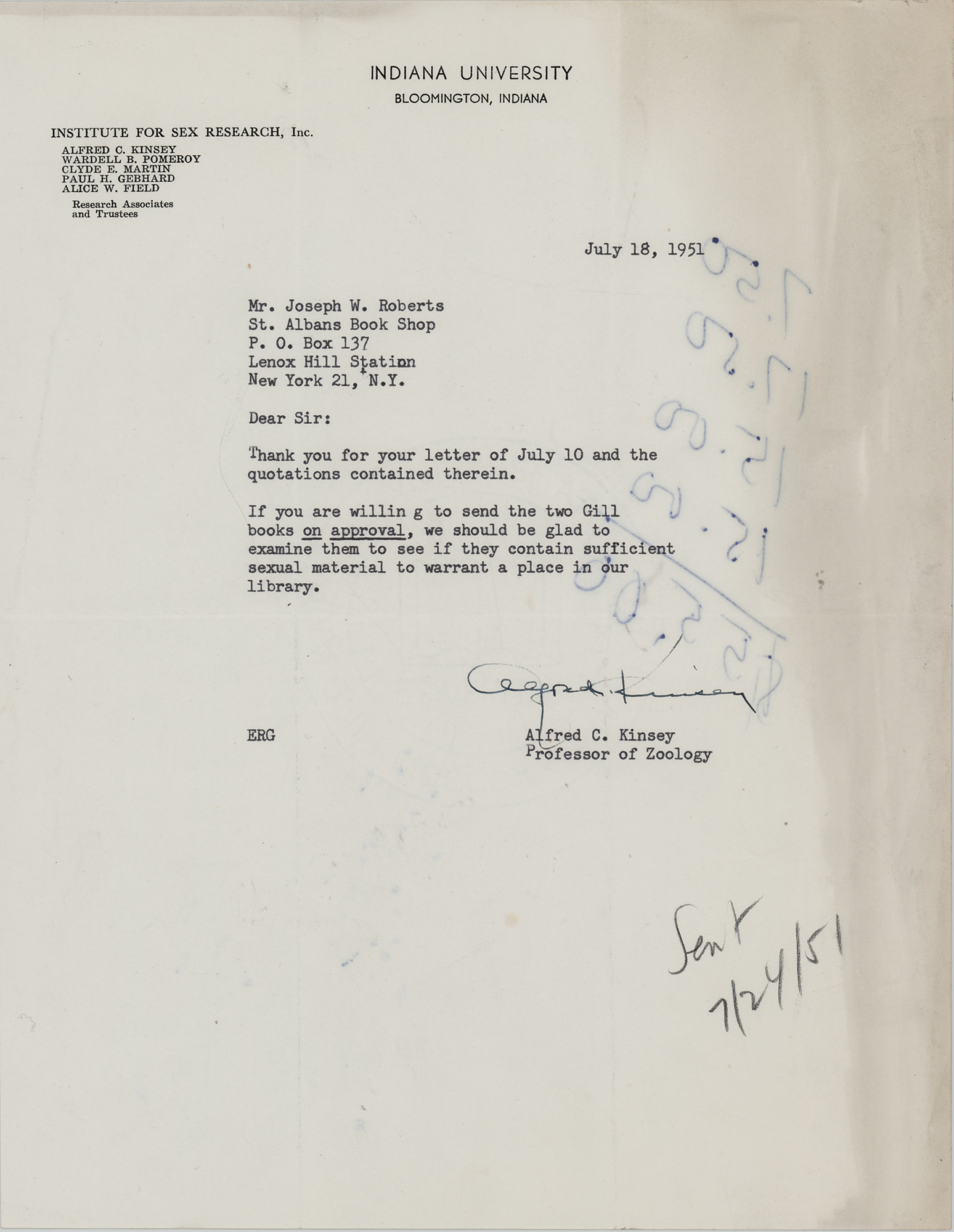 Biologist (1894-1956) who in 1947 founded the Institute for Sex Research at Indiana University, and whose research on human sexuality created the modern field of sexology. TLS, one page, 8.5 x 11, Indiana University letterhead, July 18, 1951. Letter to Joseph W. Roberts of St. Albans Book Shop, in part: "If you are willing to send the two Gill books on approval, we should be glad to examine them to see if they contain sufficient sexual material to warrant a place in our library." In very good to fine condition, with light creasing and toning to the right edge, and show-through from unrelated calculations on the back.
