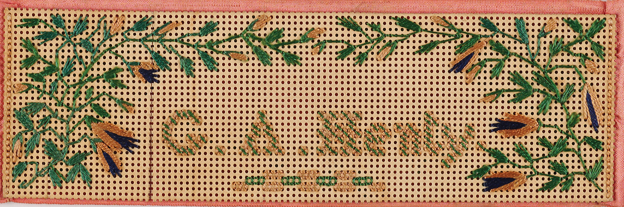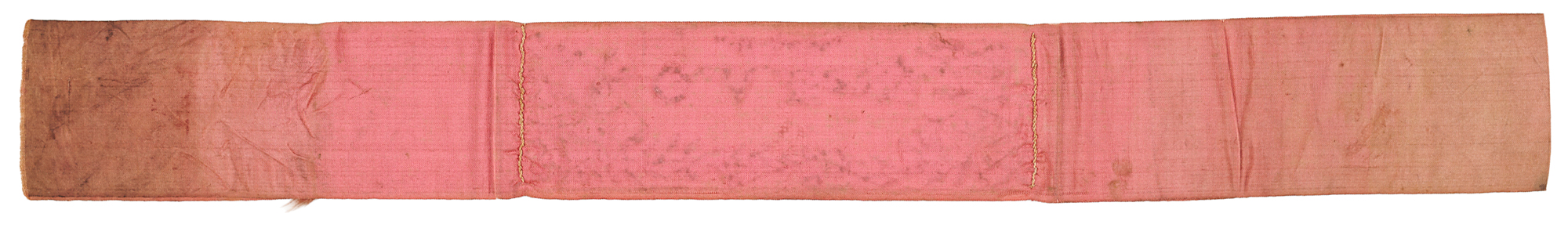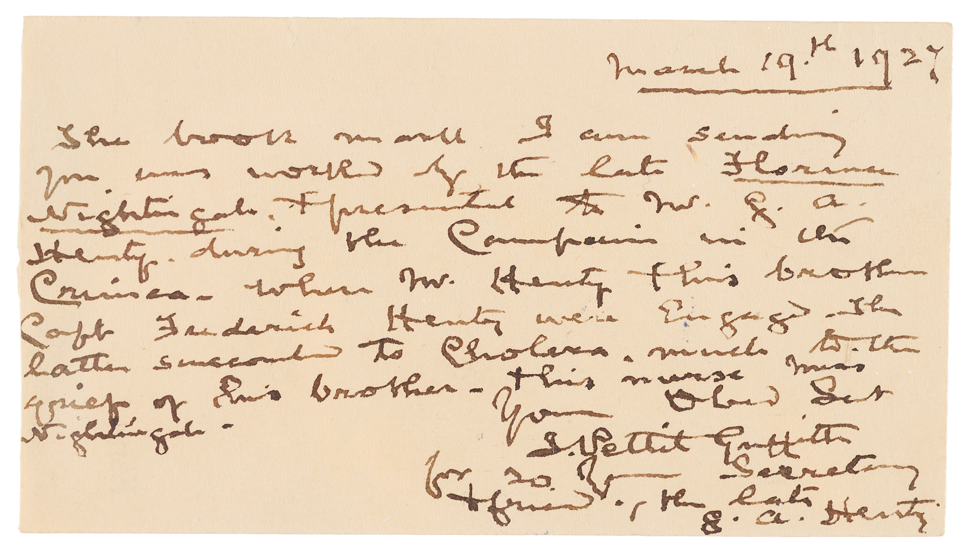 Pink silk bookmark embroidered by Florence Nightingale for English novelist and war correspondent G. A. Henty, measuring 12.5˝ x 1.5˝, with a white patch at center, embroidered with a floral design and his name, "G. A. Henty." Includes a handwritten provenance note from S. Pettit Griffith, Henty's friend and secretary, in part: "The book mark I am sending you was worked by the late Florence Nightingale & presented to Mr. G. A. Henty during the Campaign in the Crimea, where Mr. Henty & his brother Capt. Frederick Henty were engaged. The latter succumbed to cholera, much to the grief of his brother—& his nurse was Nightingale." Housed in a hardcover folder from the "Autograph Collection of Dr. Max Thorek." In fine condition.