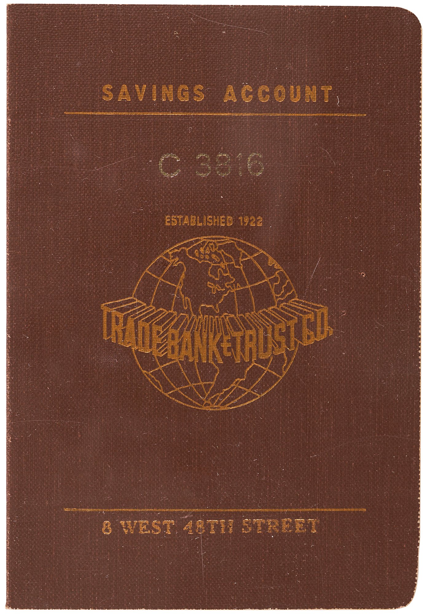 Marilyn Monroe’s savings account booklet from the Trade Bank and Trust Company of New York City, twelve pages, 3.5 x 5, with the first statement page identifying the account holder in type as “Marilyn Monroe,” with passbook serial number “C 3816,” a number also present on the front cover. Only the opening page contains account details, consisting of a deposit of $10,000 on January 5, 1956, and a withdrawal of the untouched deposit on October 16, 1957; with accrued interest, Monroe withdrew a total of $10,471.72. The first two pages are stamped twice “Cancelled.” In very fine condition.