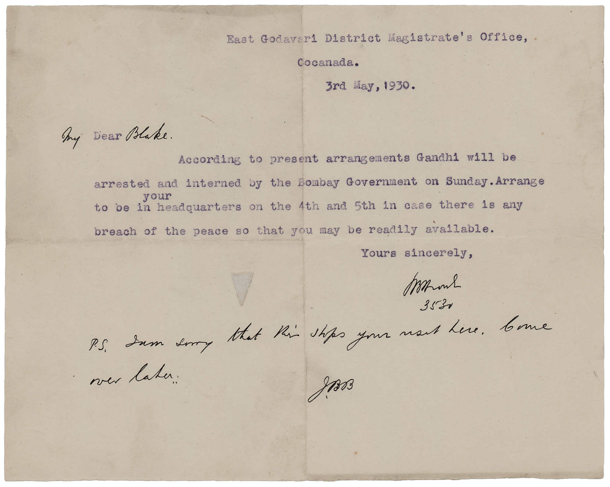 Police order issued to the East Godavari District Magistrate's Office in Cocanada, one page, 8.5 x 6.75, May 3, 1930, related to the arrest of Gandhi following his 'Salt March.' In full: "According to present arrangements Gandhi will be arrested and interned by the Bombay Government on Sunday. Arrange to be in your headquarters on the 4th and 5th in case there is any breach of the peace so that you may be readily available." In fine condition.