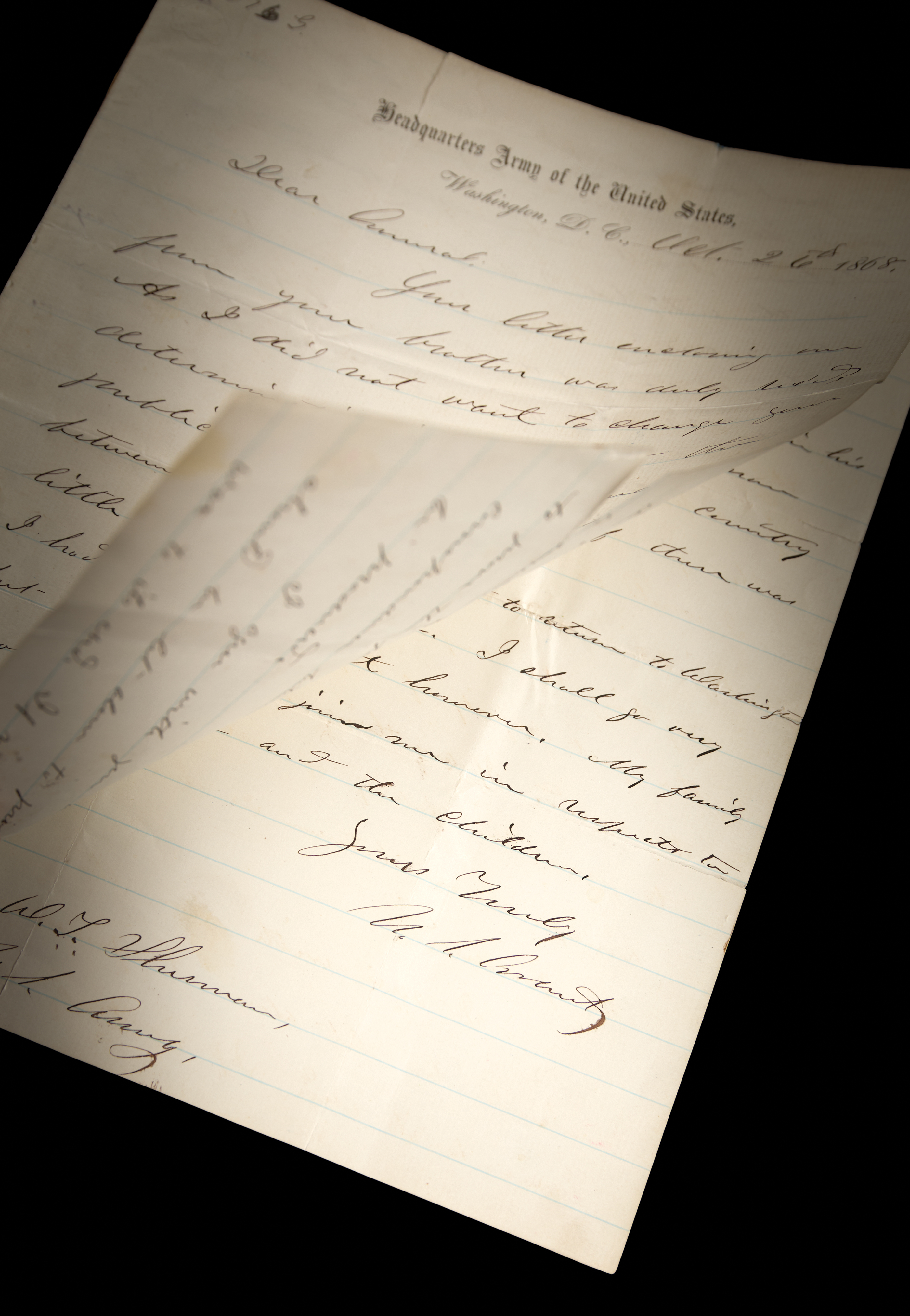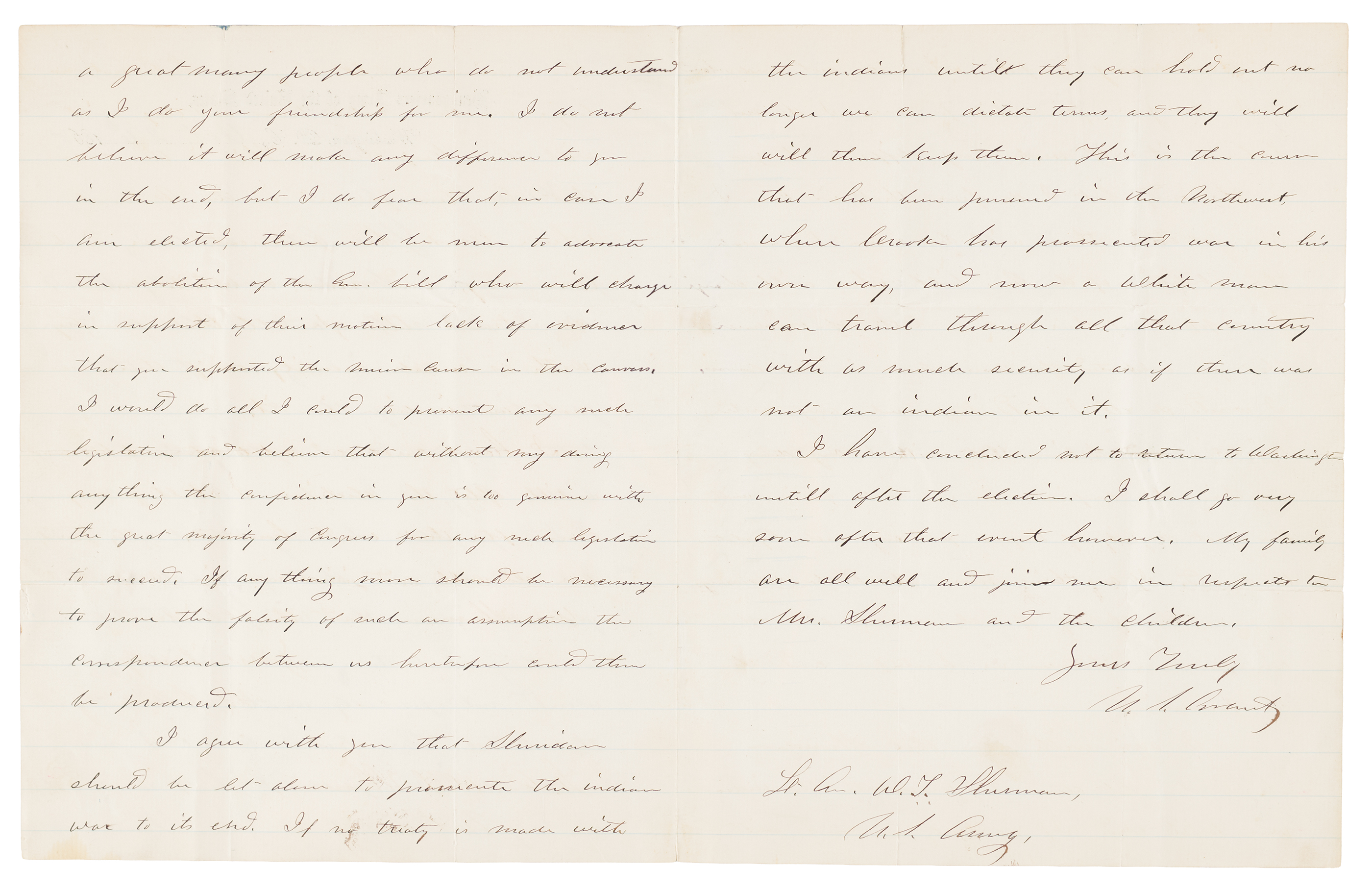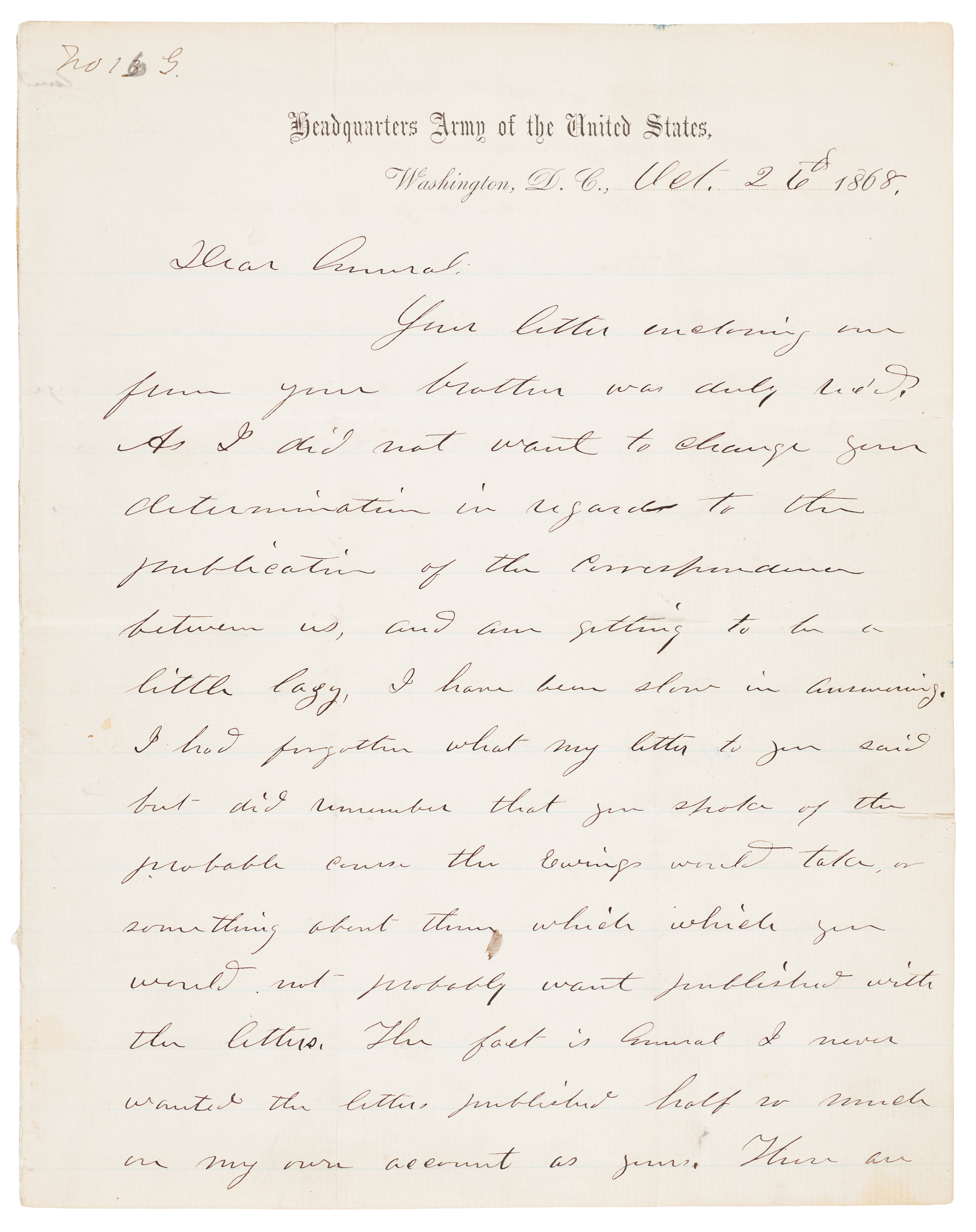 ALS signed “U. S. Grant,” three pages on two adjoining sheets, 7.75 x 10, Headquarters Army of the United States letterhead, October 26, 1868. Handwritten letter to "Lt. Gen. W. T. Sherman, U.S. Army," written just days before the presidential election of 1868. In full: "Your letter enclosing one from your brother was duly rec'd. As I did not want to change your determination in regard to the publication of the correspondence between us, and am getting to be a little lazy, I have been slow in answering. I had forgotten what my letter to you said but did remember that you spoke of the probable course the Ewings would take, or something absent them, which which you would not probably want published with the letters. The fact is General I never wanted the letters published half so much as my own account as yours.