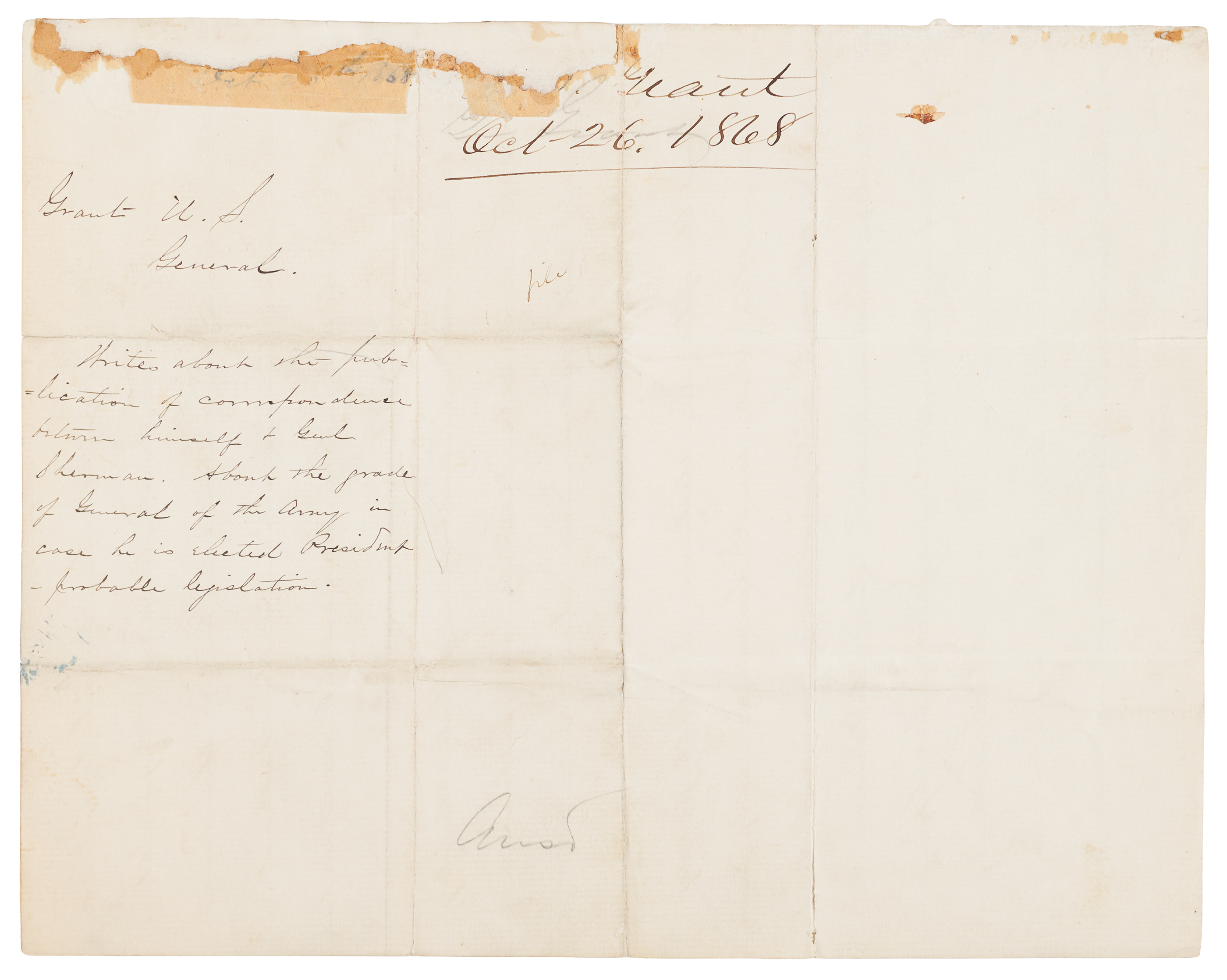 William T. Sherman dockets the reverse in his own hand, in full: "Grant, U. S., General, Writes about the publication of correspondence between himself & Genl. Sherman. About the grade of General of the Army in case he is elected President—probable legislation." In fine condition, with minor splitting to the ends of the folds, and some old mounting remnants to the back of the last page.