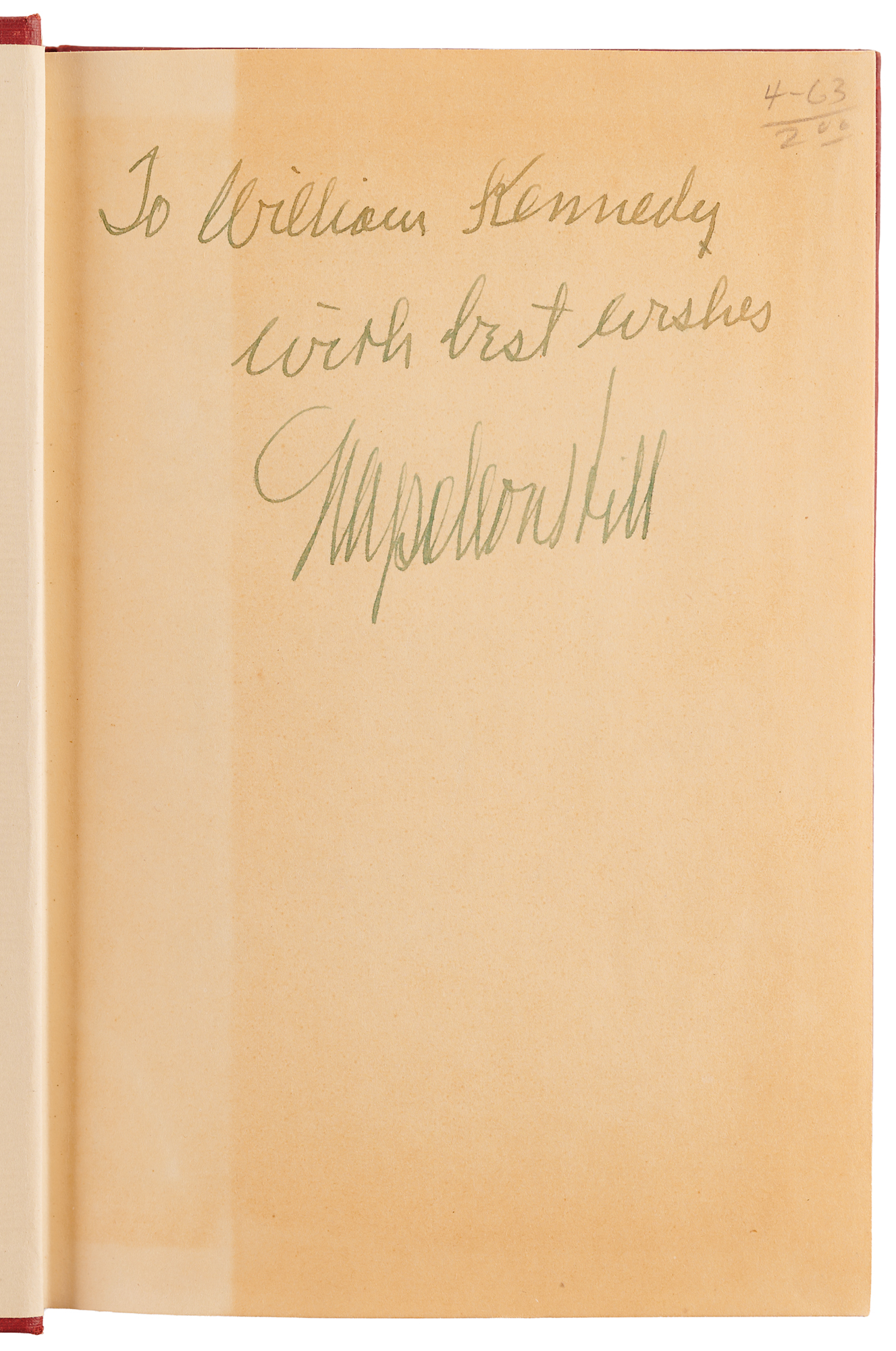 American self-help author (1883–1970) best known for his bestseller Think and Grow Rich. Signed book: Think and Grow Rich. Later printing. Cleveland: The Ralston Society, 1945. Hardcover, 5.25 x 7.5, 380 pages. Signed and inscribed on the first free end page in fountain pen, "To William Kennedy, with best wishes, Napoleon Hill." Autographic condition: very good to fine condition, with irregular light toning to the signed page. Book condition: VG/None.