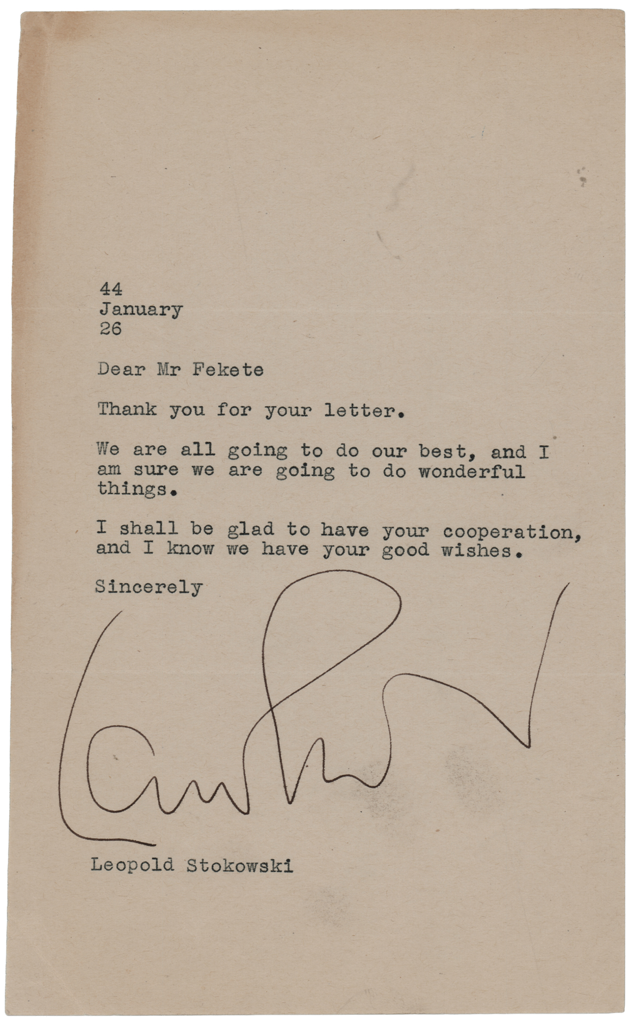 English conductor of Polish descent (1882–1977) who is best known for his long association with the Philadelphia Orchestra and his appearance in the Disney film Fantasia. TLS, one page, 5 x 8.5, January 26, 1944. Letter to "Mr. Fekete," in full: "Thank you for your letter. We are all going to do our best, and I am sure we are going to do wonderful things. I shall be glad to have your cooperation, and I know we have your good wishes." In fine condition, with some light toning to the tastefully trimmed edges.