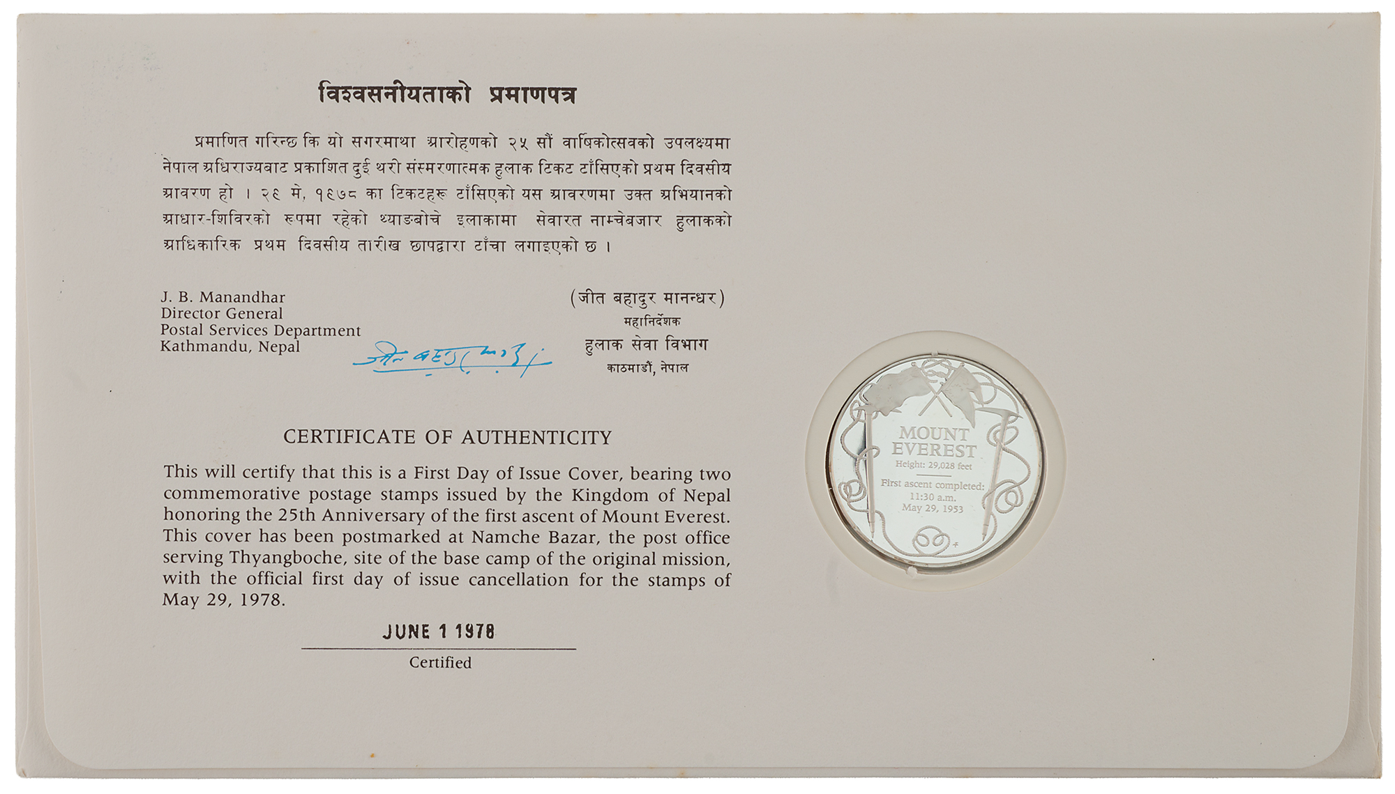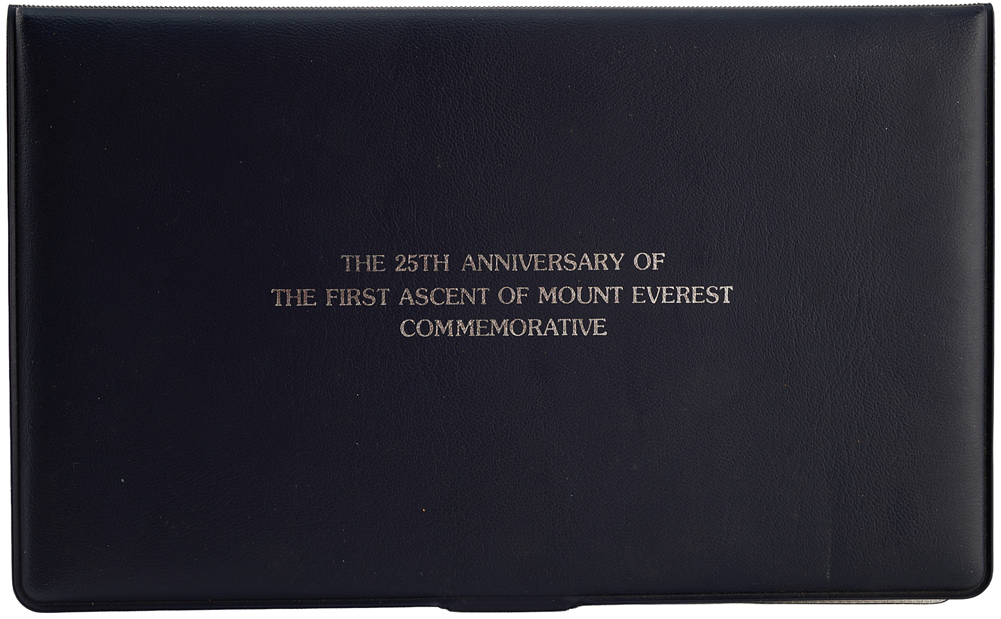 Commemorative cover with a cachet and inlaid medallion honoring the 25th anniversary of the first ascent of Mount Everest, 8 x 4.5, signed in black ballpoint by Edmund Hillary and Tenzing Norgay. Housed in its original presentation wallet, which bears a slice to the inner sleeve. In fine condition.