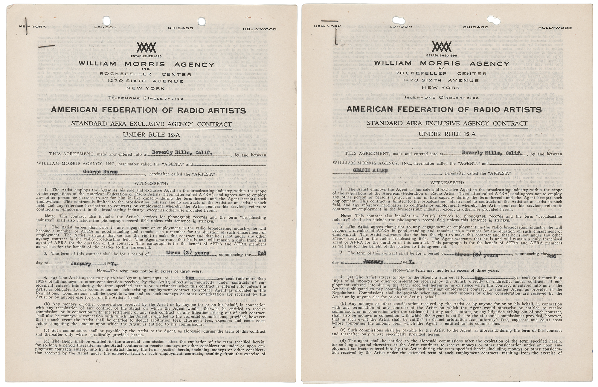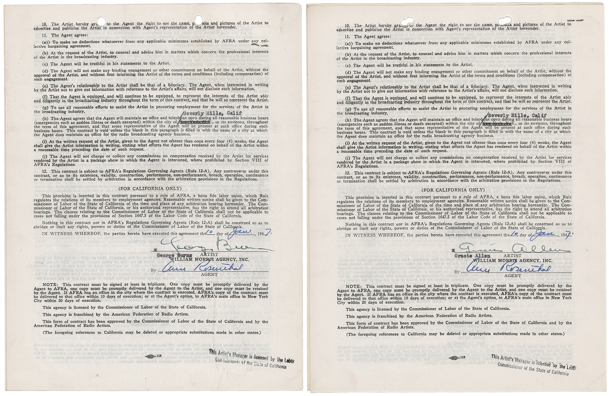 Two DSs individually signed by George Burns and Gracie Allen, both four pages, 8.5 x 11, dated January 10, 1947. Both documents are Standard AFRA (American Federation of Radio Artists) exclusive agency contracts with the William Morris Agency, with both Burns and Allen employing the agency for a term of three years. The comedians sign in fountain pen at the conclusion of their respective contracts. In overall fine condition.