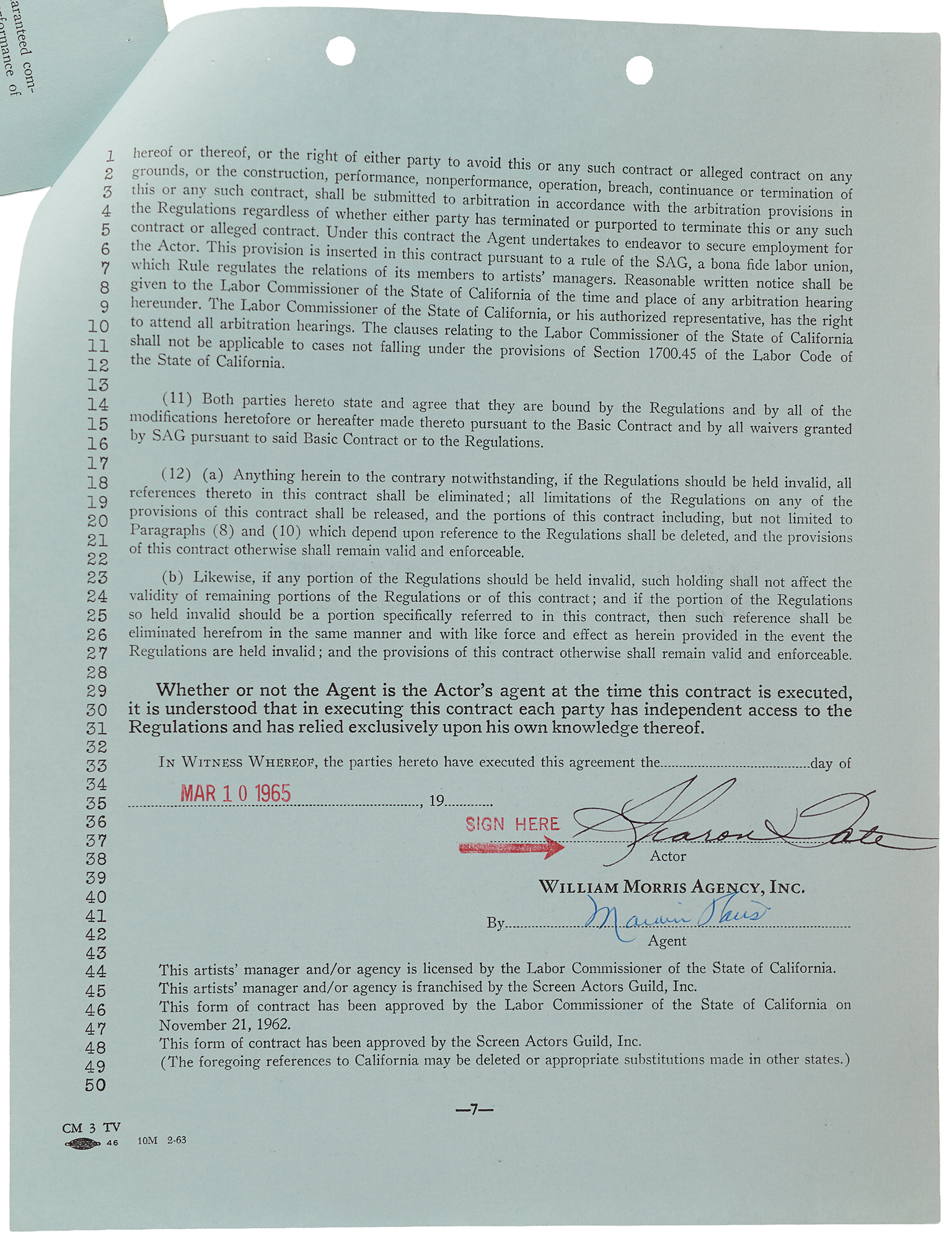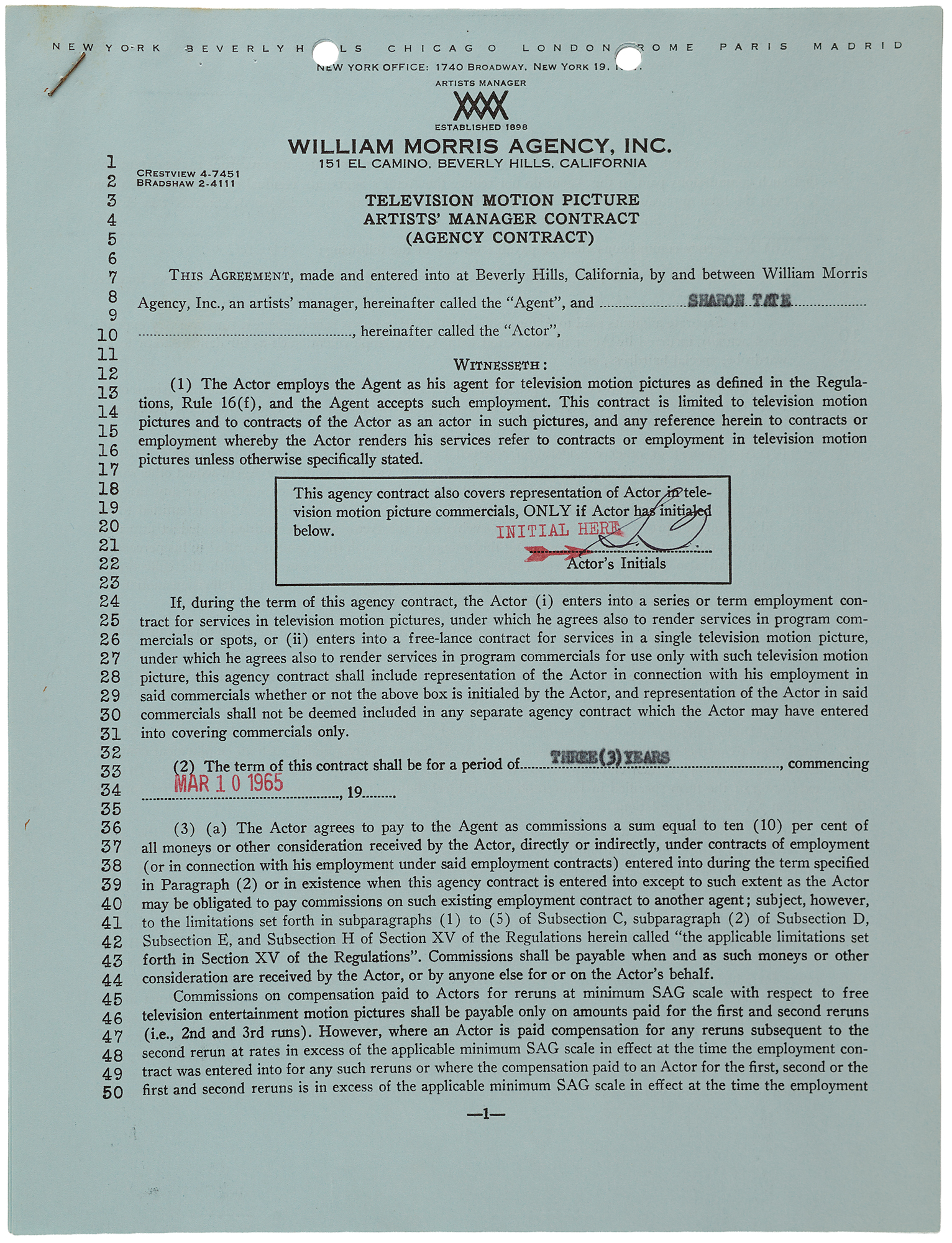 DS, seven pages, 8.5 x 11, March 10, 1965. Television Motion Picture Artist's Manager Contract between the William Morris Agency and Sharon Tate, who employs the former for a period of three years. Signed at the conclusion in black ink by Tate. In fine condition. A notable early contract marking Sharon Tate’s transition from small television roles into a professionally managed film career.