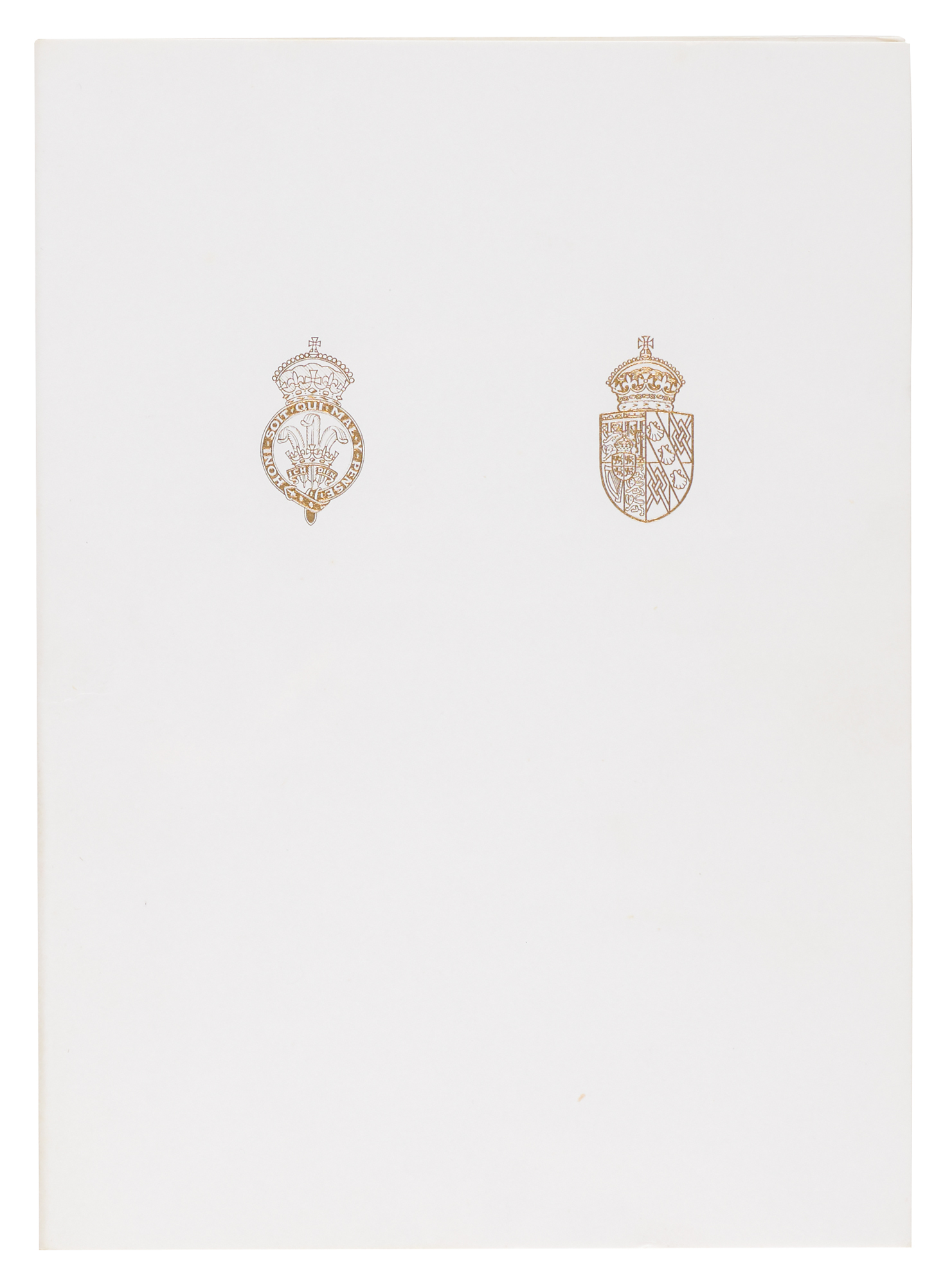 Royal Christmas card from 1983, embossed in gold on the front with the Prince of Wales’s feathers and Order of the Garter motto and the Spencer family arms, measuring 10.5 x 7.25 open, featuring an affixed color photo of Charles in a kilt and Diana sitting on a swing with toddler Prince William, signed inside in fountain pen, “from Charles and” and “Diana.” In fine condition. Accompanied by the original mailing envelope.