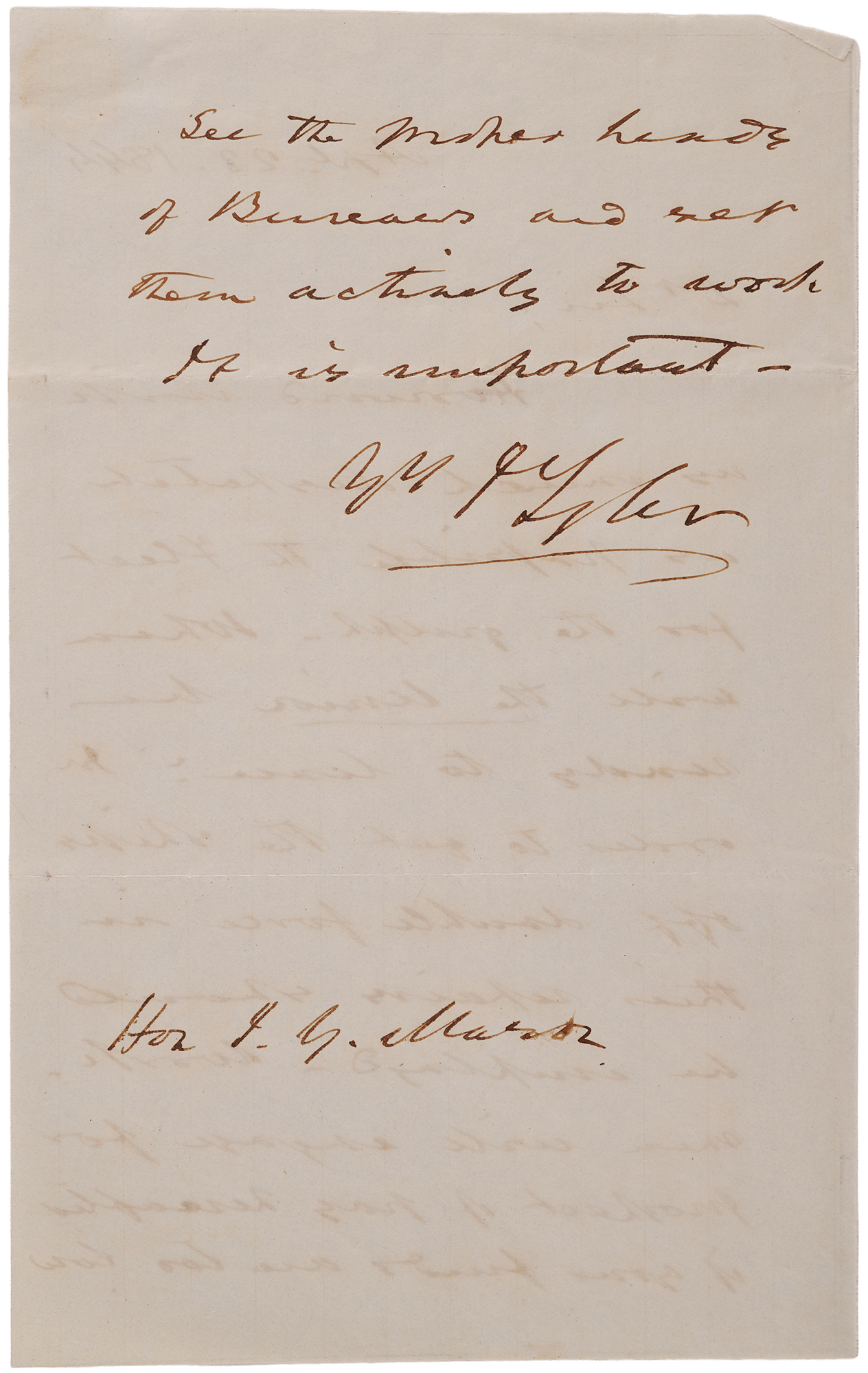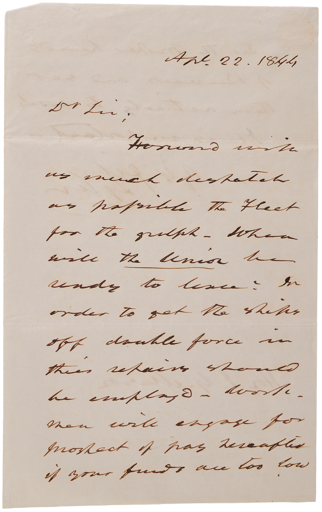 ALS signed “J. Tyler,” one page both sides, 5 x 8, April 22, 1844. Handwritten letter to Secretary of the Navy John Y. Mason, in full: "Forward with as much dispatch as possible the Fleet for the gulph. When will the Union be ready to leave? In order to get the ships off double force in their repair should be employed. Workmen will engage for prospect of pay hereafter if your funds are too low see the proper heads of Bureaus and get them actively to work. It is important." In fine condition.