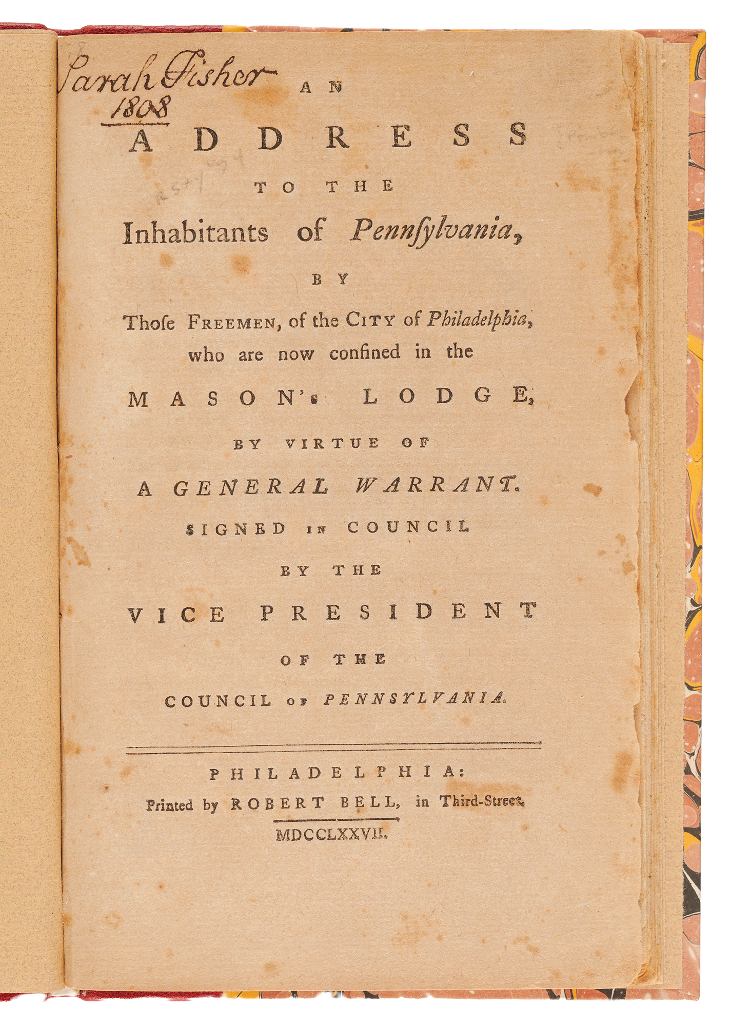 Scarce book: An Address to the Inhabitants of Pennsylvania, by Those Freemen, of the City of Philadelphia, who are now confined in the Mason's Lodge, by virtue of a General Warrant Signed in Council by the Vice President of the Council of Pennsylvania. Philadelphia: Robert Bell, 1777. Rebound hardcover in quarter morocco with marbled boards, 5.25 x 8.25, 52 pages. The text, signed in type by Israel Pemberton and twenty-one others, includes copies of orders of the Supreme Executive Council, remonstrances addressed to the Council, and other papers upon the state's arrest of Quakers (including himself) on suspicion of Loyalist sympathies during the Revolutionary War, and their confinement without a hearing or trial. Book condition: VG/None, with mottled foxing to textblock and an ownership inscription ("Sarah Fisher, 1808") to title page.