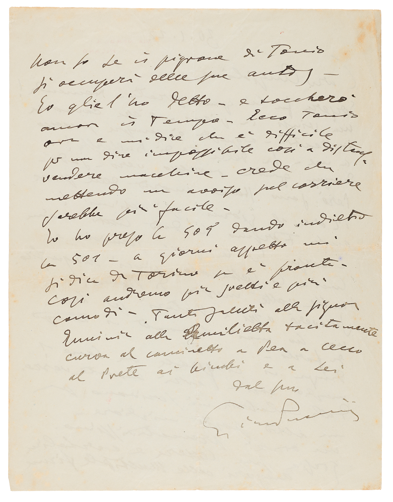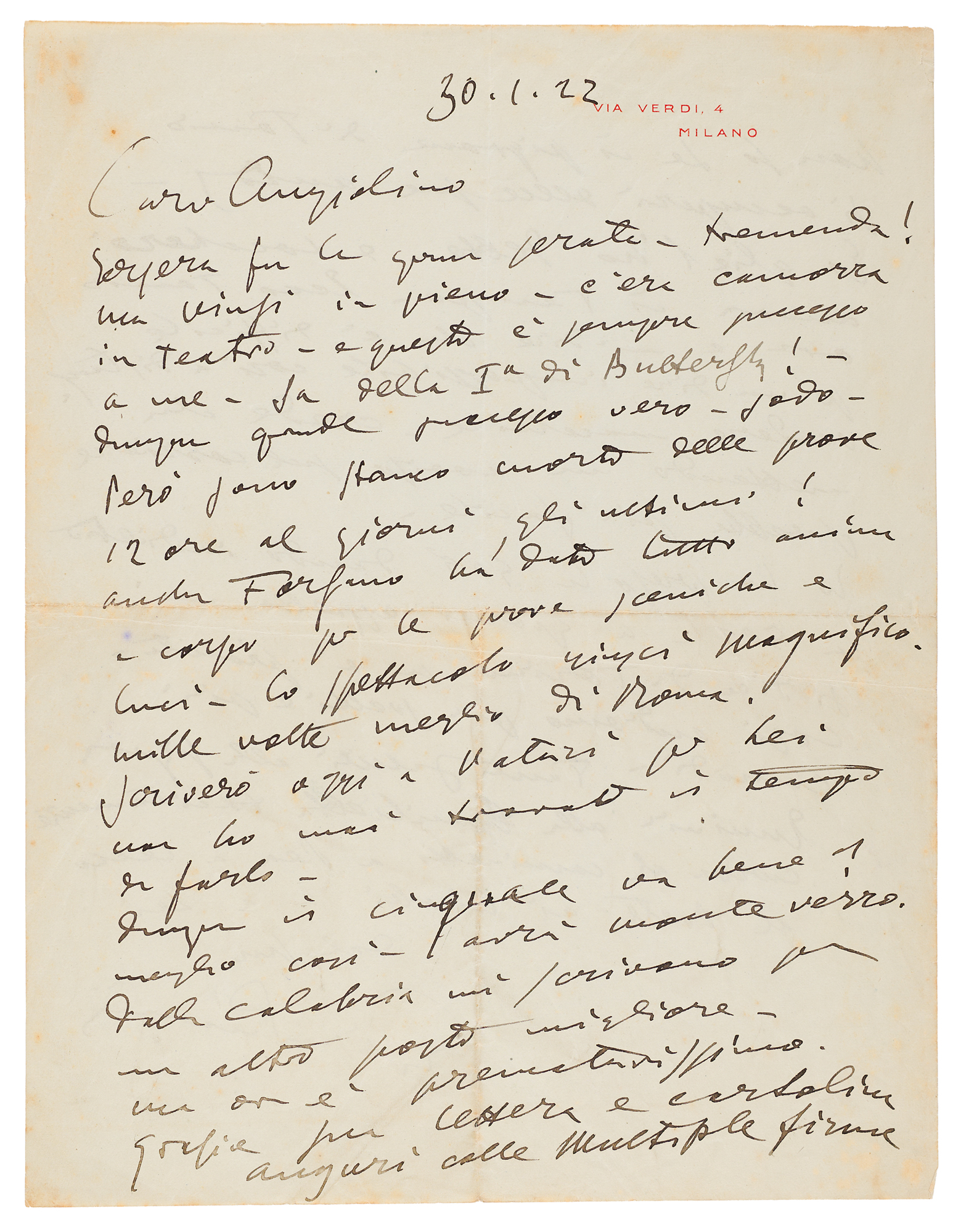 ALS in Italian, one page both sides, 8.25 x 10.75, personal letterhead, January 30, 1922. Handwritten letter regarding the performance of Il Trittico at the Teatro alla Scala in Milan. In part (translated): "Last night was the greatest evening—tremendous—a complete triumph. There were many disputes in the theatre—always a sure sign of success for me. You know how it was for the premiere of Butterfly. Thus a really complete and hard-won success. But I am dead tired…Foranzo has given all of himself as far as the lights and scenery…the performance was marvelous—a million times better than the one in Rome." In very good to fine condition, with some light staining and creasing.
