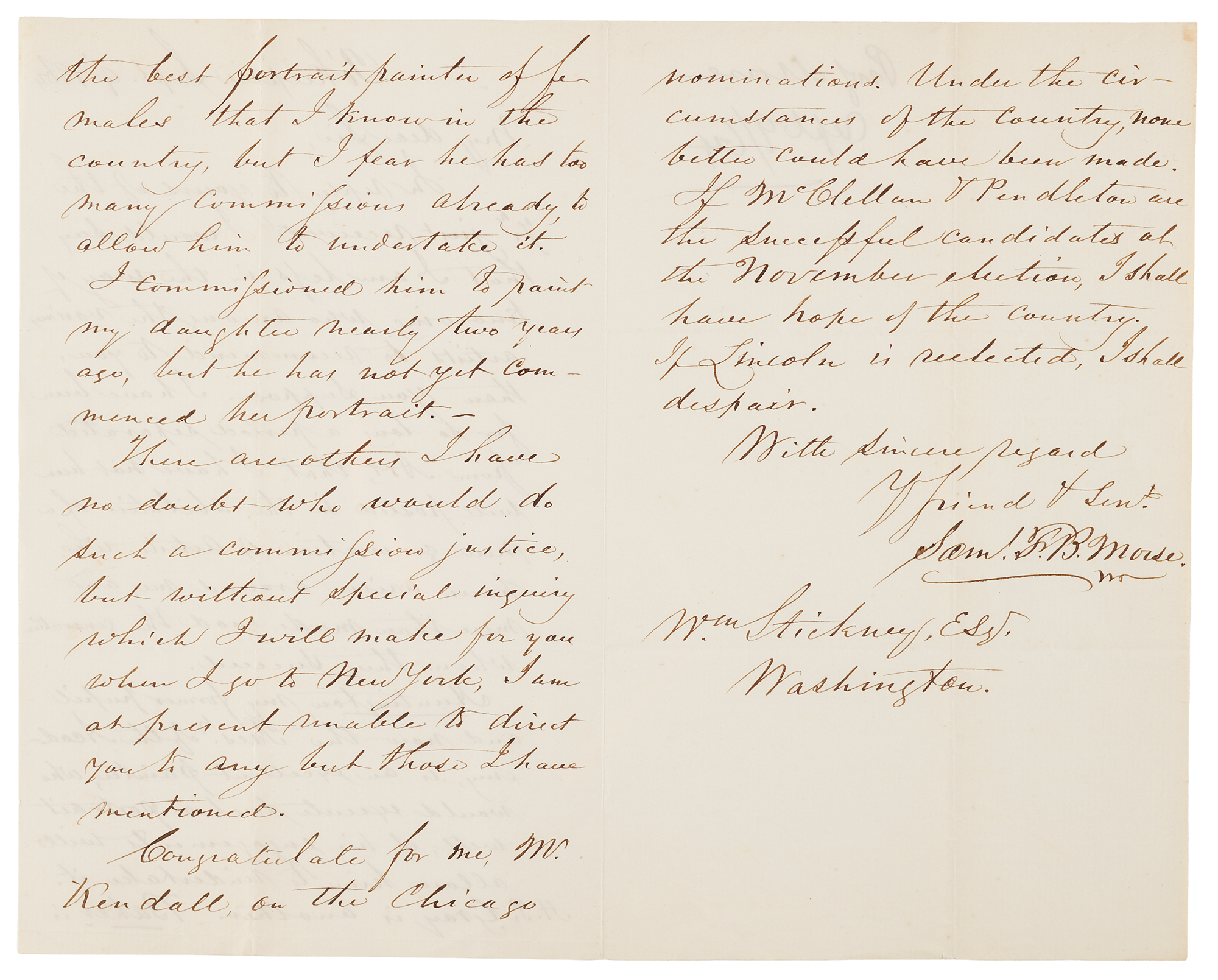 There are others I have no doubt who would do such a commission justice, but without special inquiry which I will make for you when I go to New York, I am at present unable to direct you to any but those I have mentioned. Congratulate for me, Mr. Kendall, on the Chicago nominations. Under the circumstances of the country, none better could have been made. If McClellan & Pendleton are the successful candidates at the November election, I shall have hope of the country. If Lincoln is reelected, I shall despair." In fine condition.