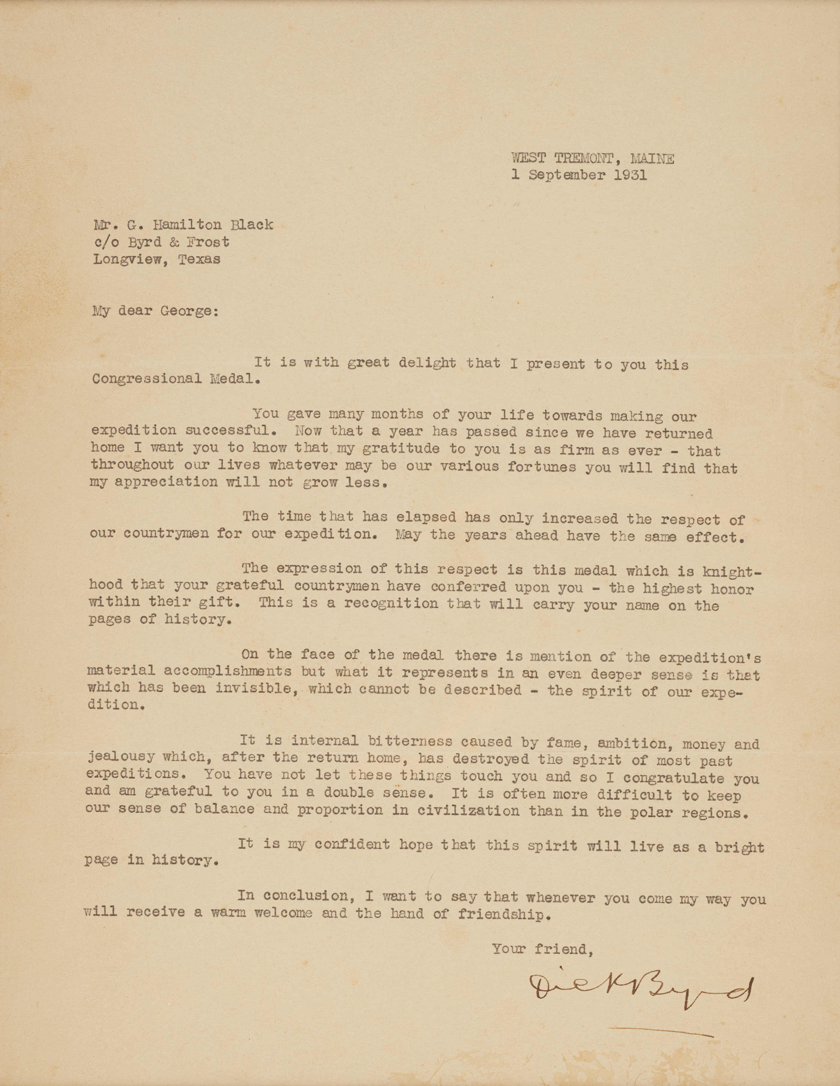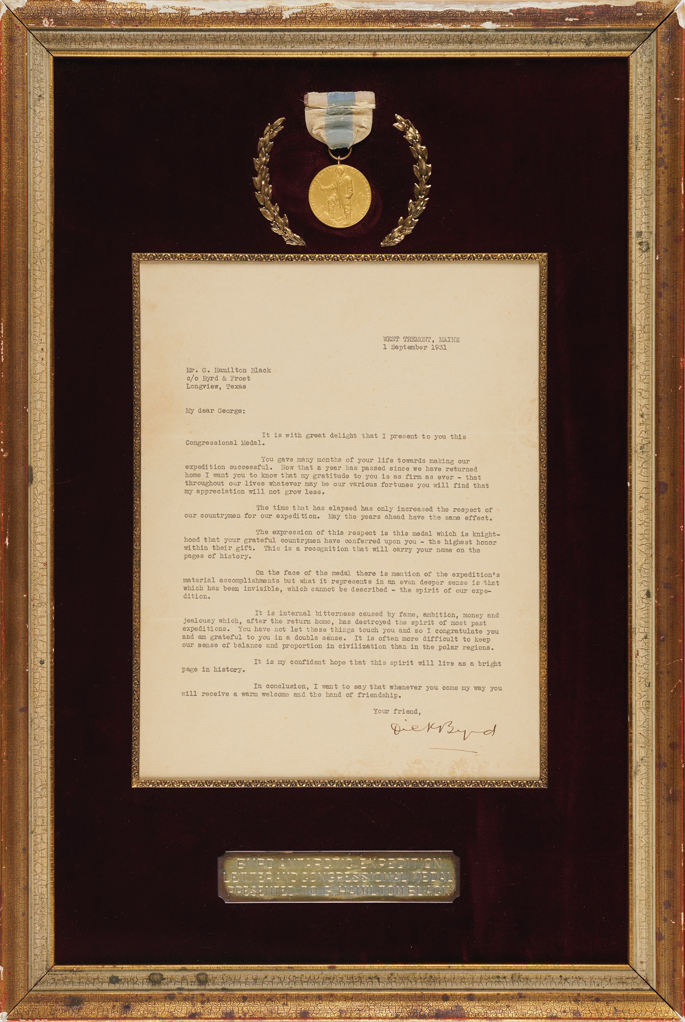 The medal is presented with its original transmittal TLS from Admiral Byrd, signed “Dick Byrd,” one page, 8.25 x 10.75, September 1, 1931. Addressed from West Tremont, Maine, the letter reads, in full: “It is with great delight that I present to you this Congressional Medal. You gave many months of your life towards making our expedition successful. Now that a year has passed since we have returned home I want you to know that my gratitude to you is as firm as ever — that throughout our lives whatever may be our various fortunes you will find that my appreciation will not grow less. The time that has elapsed has only increased the respect of our countrymen for our expedition. May the years ahead have the same effect.