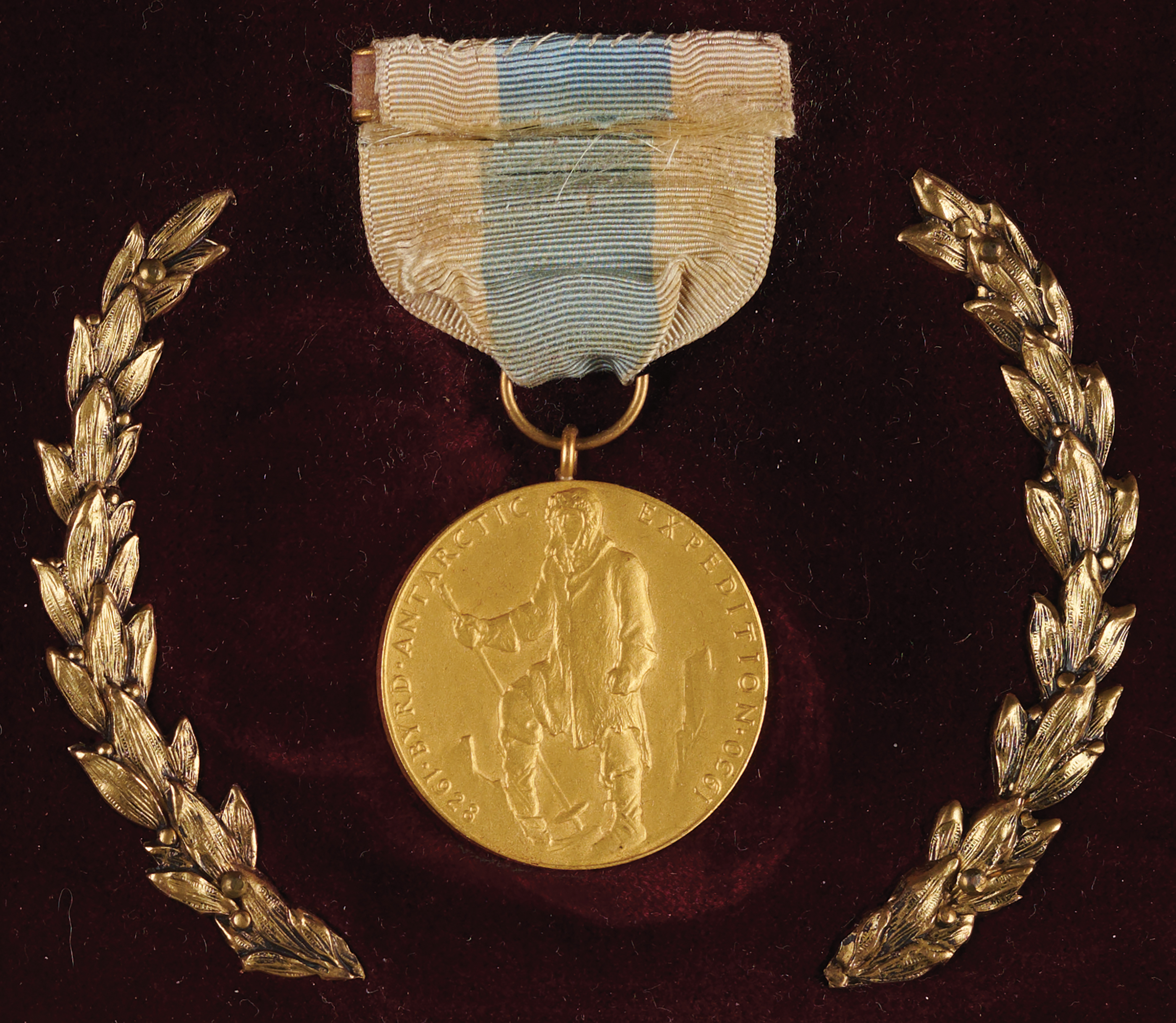Exceptionally rare Congressional Gold Medal from the Byrd Antarctic Expedition presented to George Hamilton Black, a supply officer on Richard E. Byrd’s famed Antarctic Expedition of 1928–1930. The medal, 1.25˝ in diameter, bears an embossed front design of Admiral Byrd in fur-lined arctic clothing encircled with text: “Byrd Antarctic Expedition 1928-1930.” The edge is engraved “G. Hamilton Black,” and the medal is suspended from a white silk ribbon with a light blue center stripe. The reverse (hidden due to framing) features the sailing ship City of New York, surrounded by dedication text: ‘Presented to the Officers and Men of the Byrd Antarctic Expedition to Express the High Admiration In Which the Congress and the American People Hold Their Heroic and Undaunted Services in Connection With the Scientific Investigation Exploration of the Antarctic Continent.’
