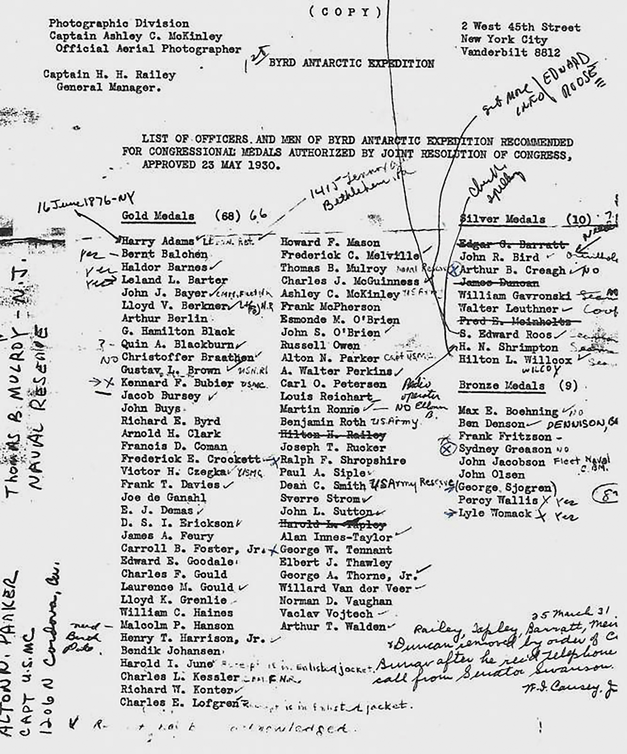 On May 23, 1930, President Herbert Hoover signed legislation enacted by the 71st Congress (1929–1931) authorizing the award of Congressional Gold, Silver, and Bronze Medals—among the highest honors bestowed by the United States Congress—to members of Rear Admiral Richard E. Byrd’s first Antarctic expedition. Byrd, already renowned for his pioneering Arctic flights, led the expedition to Antarctica in December 1928, where the team established their base—dubbed ‘Little America’—on the Ross Ice Shelf and from which Byrd made the historic first flight over the South Pole in November 1929.