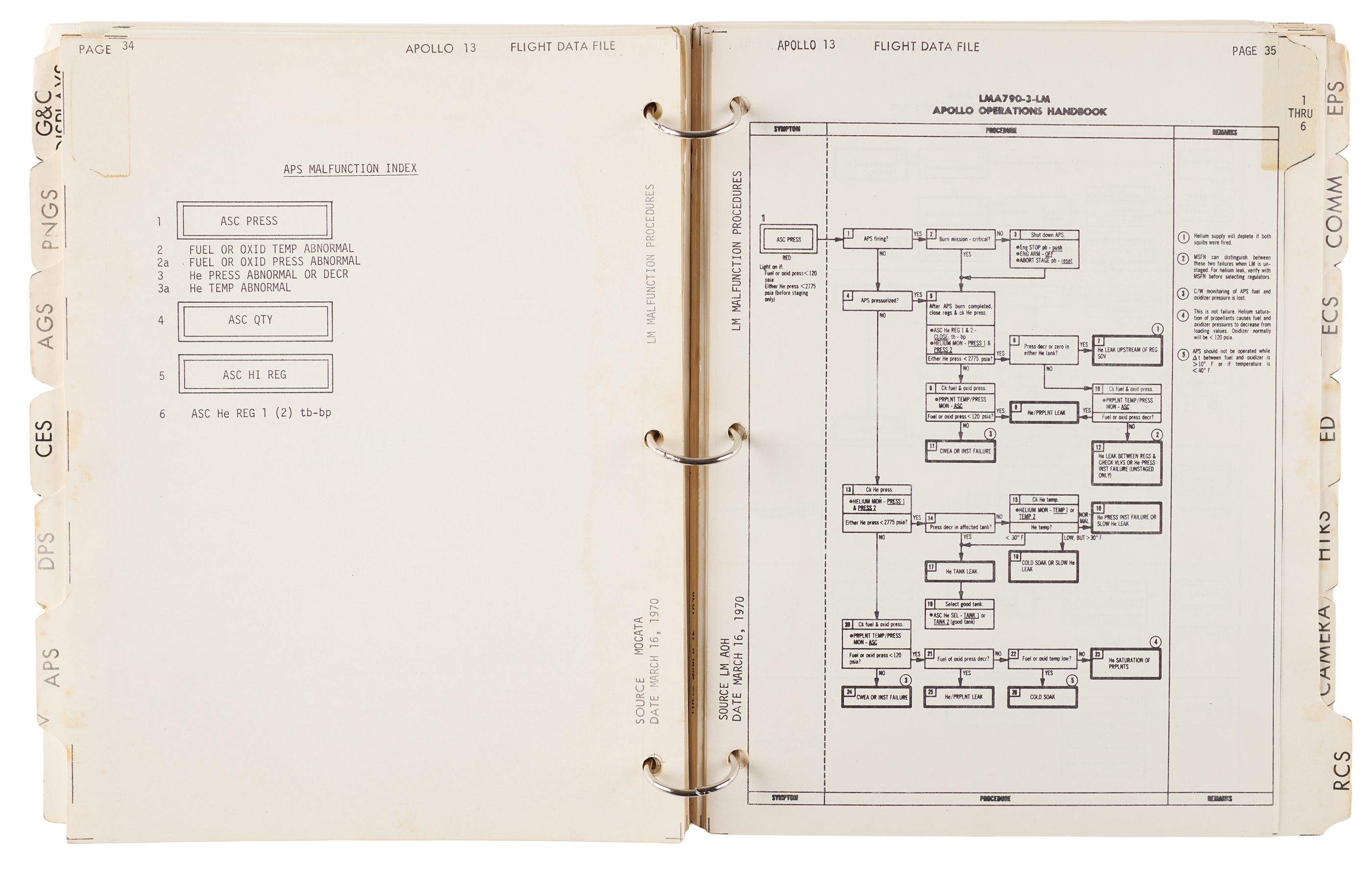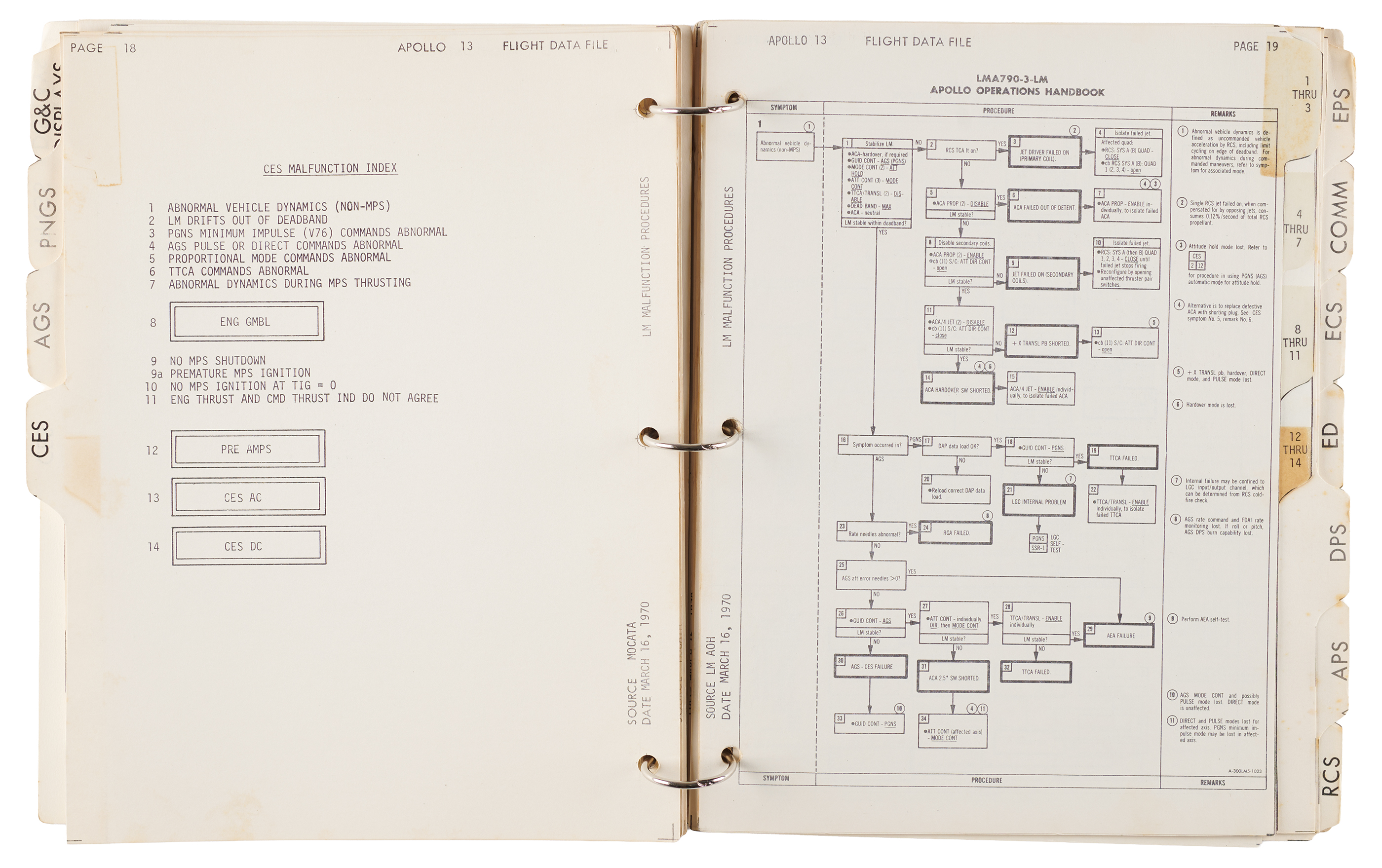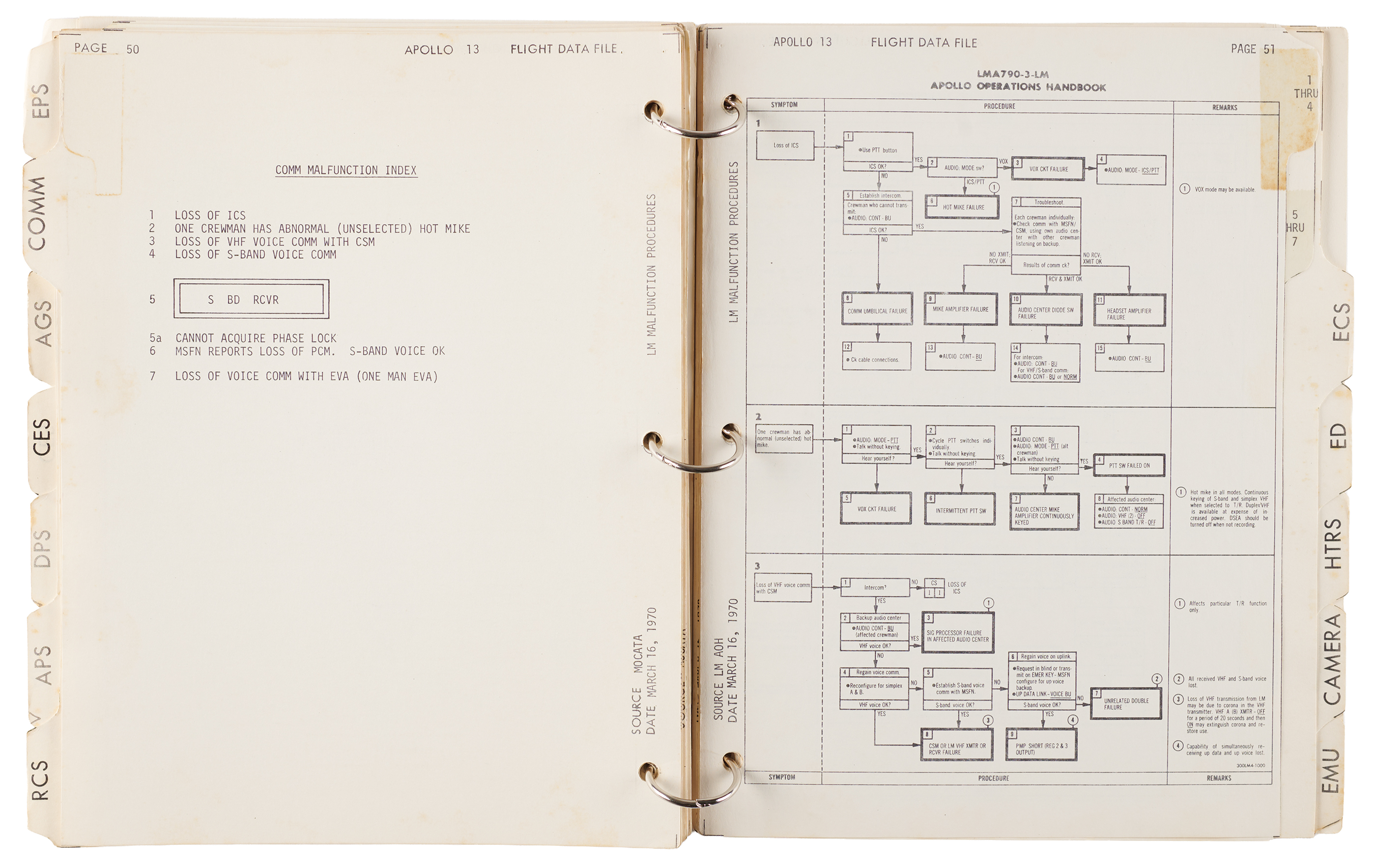 Official ring-bound NASA ‘quarters copy’ of the Apollo 13 LM Malfunction Procedures manual, 80 pages plus cardstock covers, 8.5 x 10.5, dated April 1, 1970, signed on the front cover in blue ink, “Used in training for Apollo 13, James Lovell, Commander” and “Fred Haise, Lunar Module Pilot, Apollo 13.” Ink notations on the front cover and title page read "QTRS." Issued as 'final change A' with part number "SKB32100076-386," the manual consists of a variety of sections related to emergency procedures taken if a malfunction were to occur in the lunar module while on the lunar surface. Includes two original binding rings and a descriptive placard that was used when this checklist was on display at the Kansas Cosmosphere for the 40th Anniversary of Apollo 13. In fine condition. Dated 10 days before liftoff, this manual was used by Lovell and Haise during pre-launch quarantine for Apollo 13. After an oxygen tank exploded two days into the mission, the crew relied on training manuals like this to help guide their safe return to Earth.
