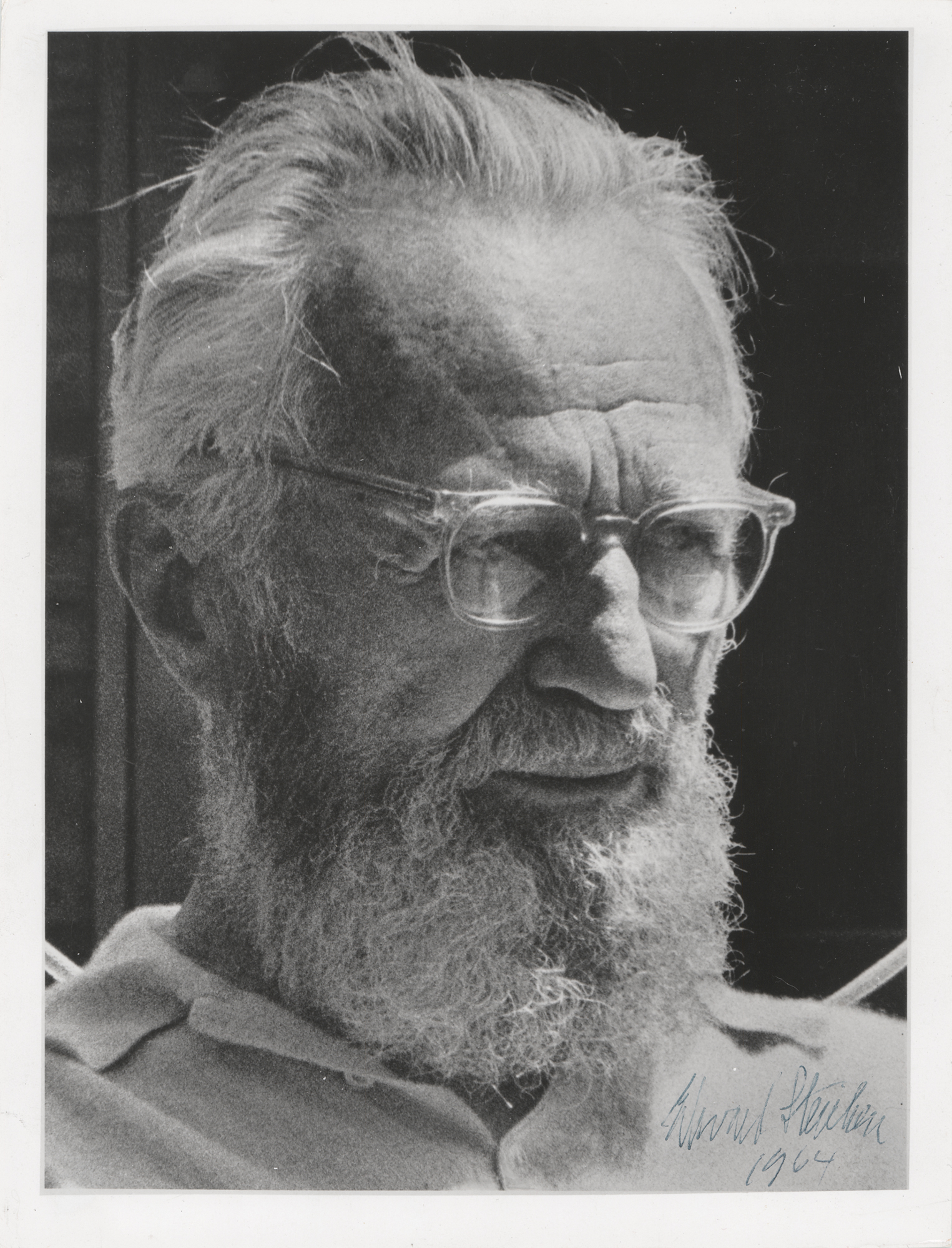 Vintage semi-glossy 7.25 x 9.5 head-and-shoulders photo of the famed photographer, signed in ballpoint, "Edward Steichen, 1964." In fine condition.