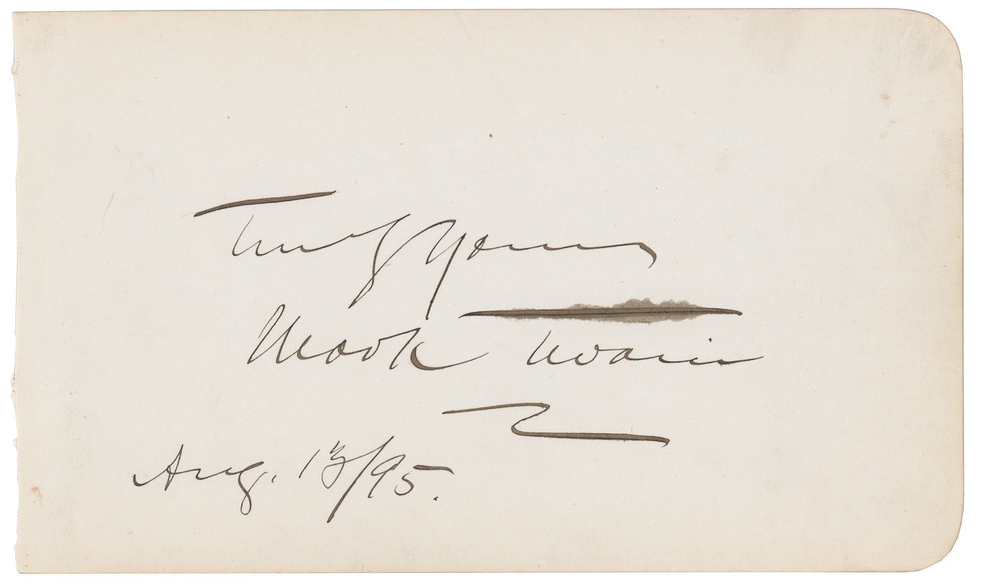Large ink signature, "Truly yours, Mark Twain, Aug. 13/95,” on an off-white 6.75 x 4 album page. In very fine condition.