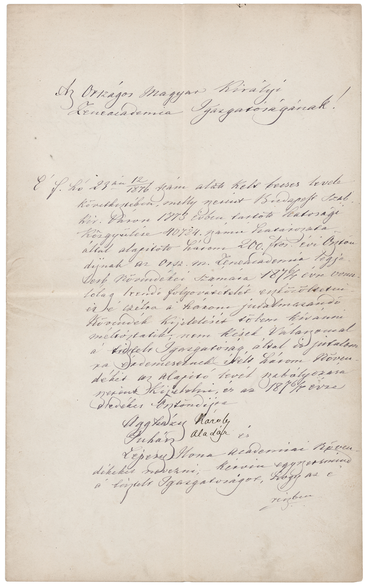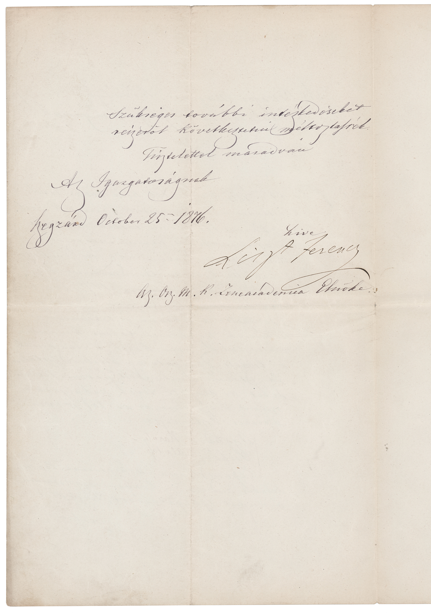 Romantic era composer and pianist (1811–1886) whose prowess at the keyboard earned him a cachet as perhaps the greatest virtuoso in the history of the instrument. LS in Hungarian, signed “Liszt Ferencz,” one page both sides, 8.25 x 13.5, October 25, 1876. Letter to the director of the Royal National Hungarian Academy of Music, making recommendations for a stipend to be awarded to talented students. In fine condition. In 1925, the Academy was renamed in honor of its founder, Franz Liszt.