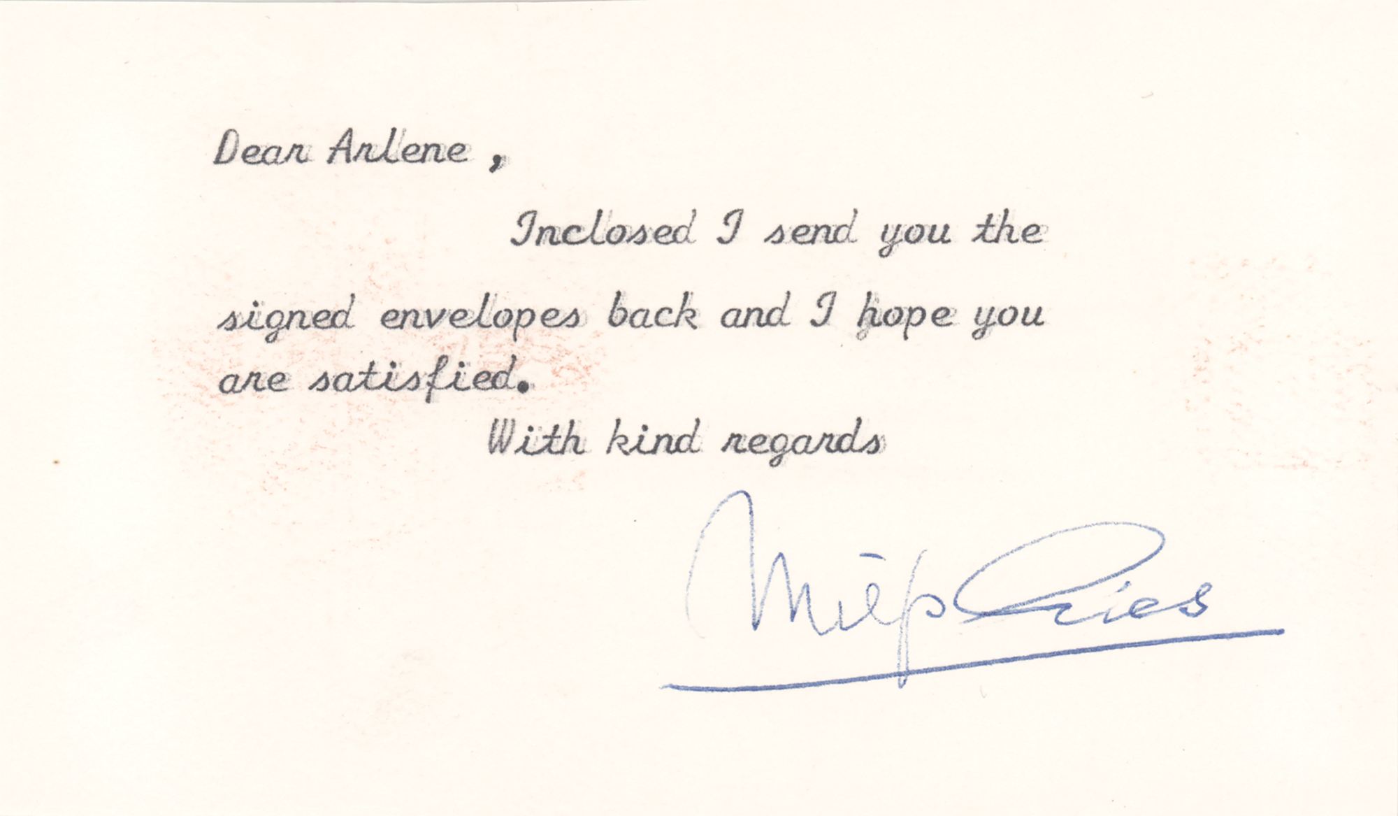 Dutch citizen (1909–2010) who hid Anne Frank, her family, and four other Dutch Jews from the Nazis during World War II. Together with her colleague Bep Voskuijl, she retrieved Anne Frank's diary after the family was arrested, and kept the papers safe until Otto Frank returned from Auschwitz in June 1945. TNS signed “Miep Gies,” one page, 5.5 x 3.25, no date. Note to "Arlene," in part: "Inclosed I send you the signed envelopes back and I hope you are satisfied." In very fine condition.
