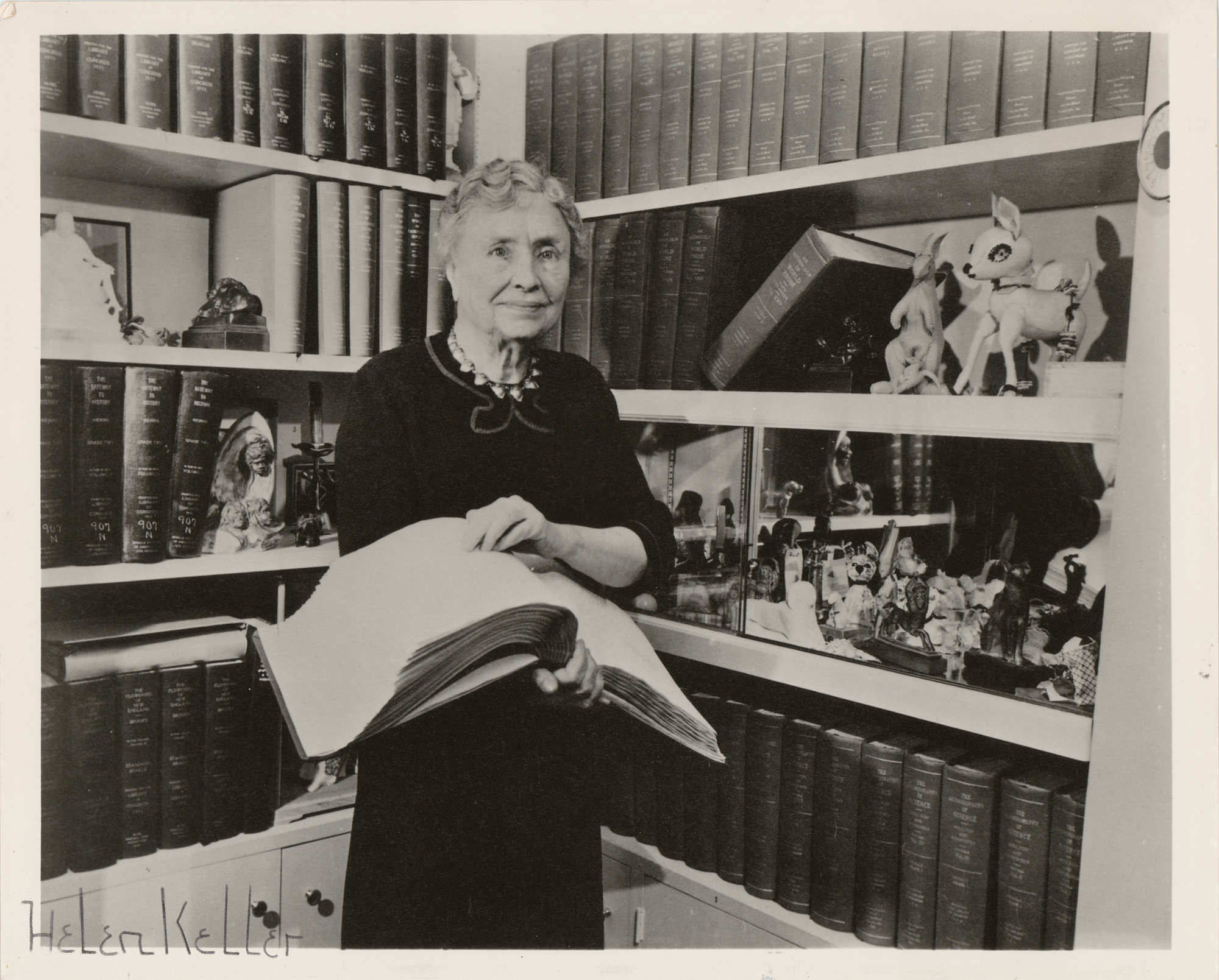 Vintage glossy 10 x 8 photo of Helen Keller holding a huge book of braille, neatly signed in the lower left in pencil. In fine condition.