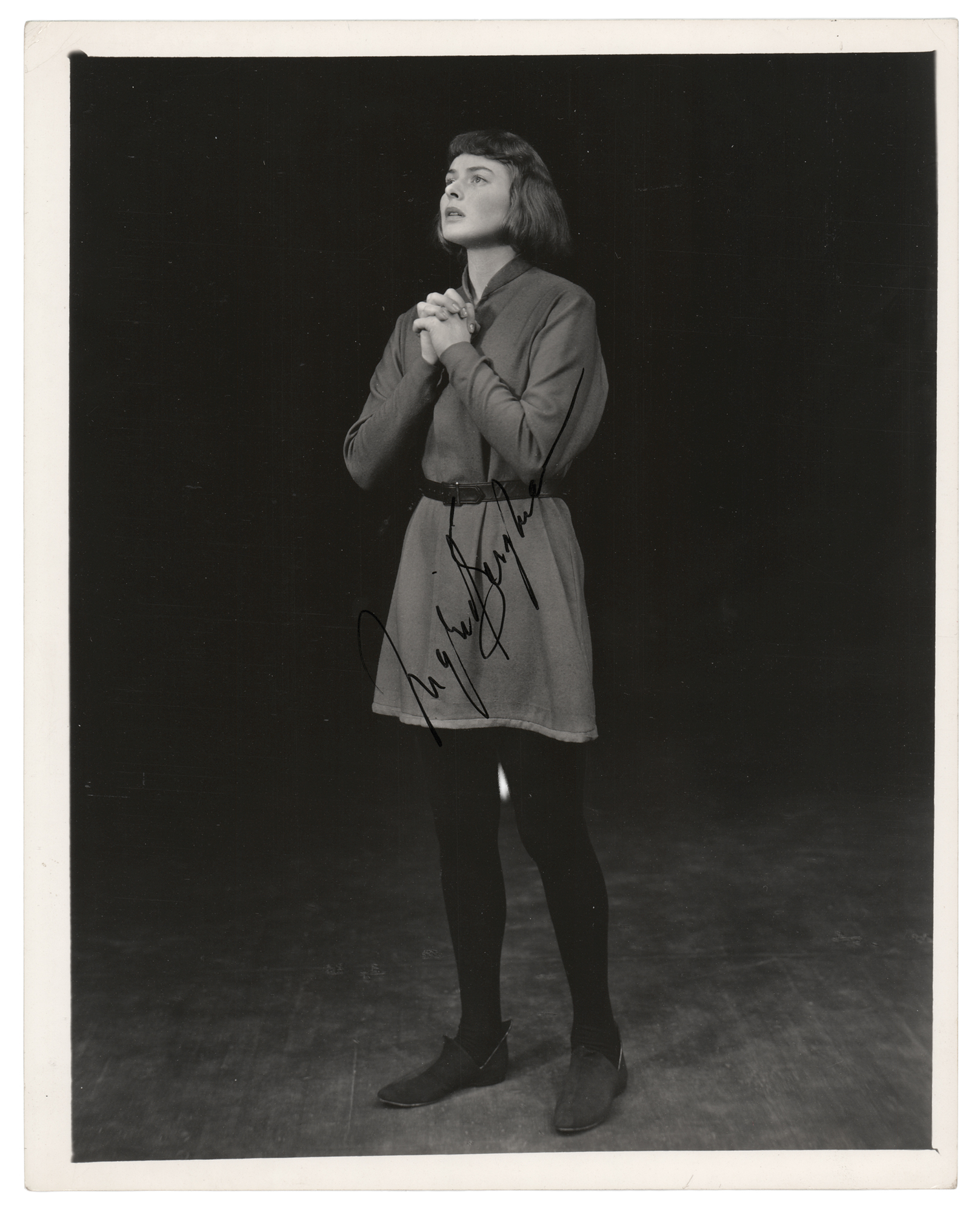 Semi-glossy 8 x 10 full-length photo of Ingrid Bergman as Joan of Arc, nicely signed in black ink. Reverse bears a "Photograph by Vandamm" credit stamp. In fine condition.