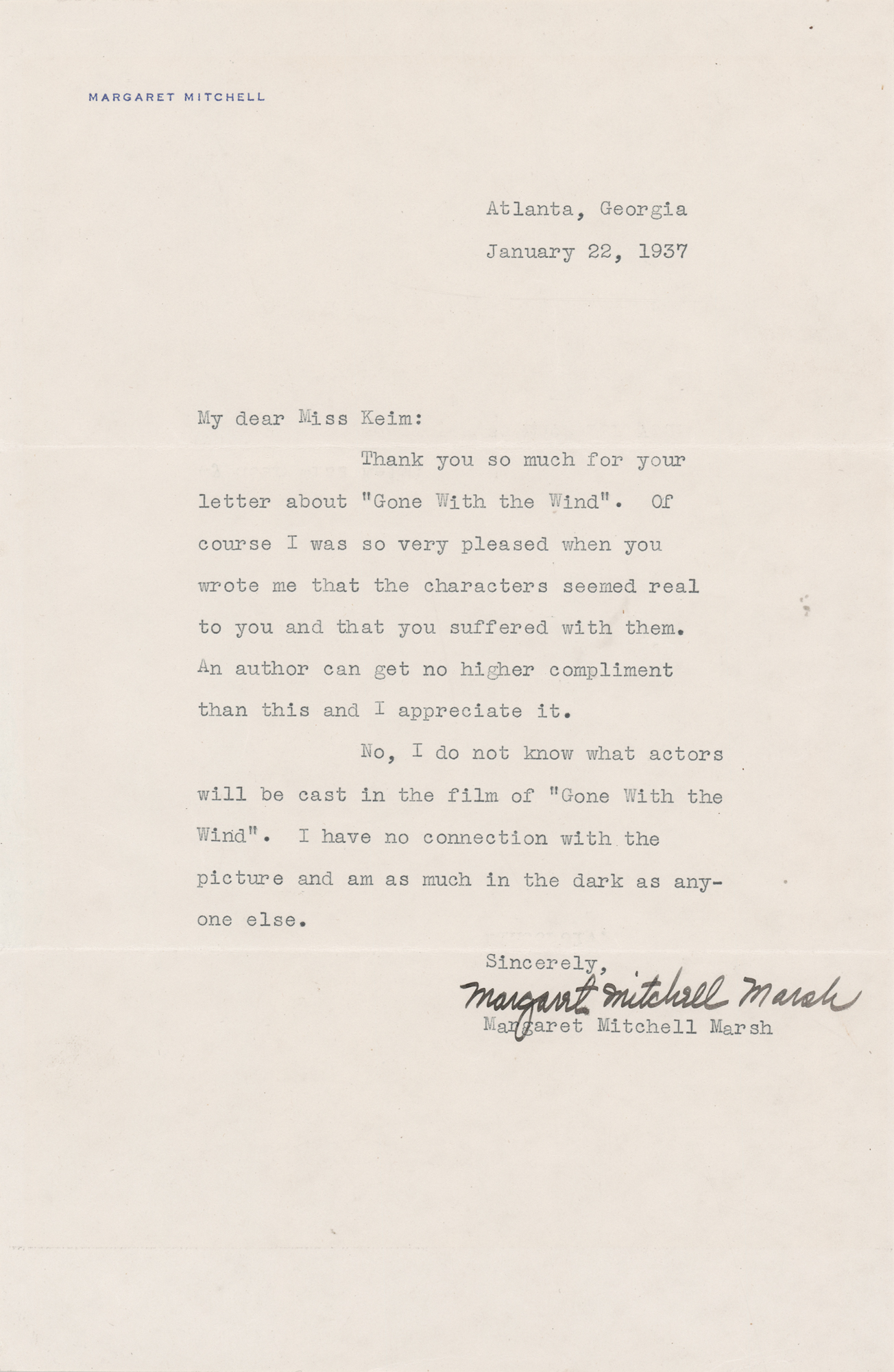 TLS signed "Margaret Mitchell Marsh," one page, 7 x 11, personal letterhead, January 22, 1937. Letter to "Miss Keim," in full: "Thank you so much for your letter about 'Gone with the Wind.' Of course I was so very pleased when you wrote me that the characters seemed real to you and that you suffered with them. An author can get no higher compliment than this and I appreciate it. No, I do not know what actors will be cast in the film of 'Gone with the Wind.' I have no connection with the picture and am as much in the dark as anyone else." In fine condition.