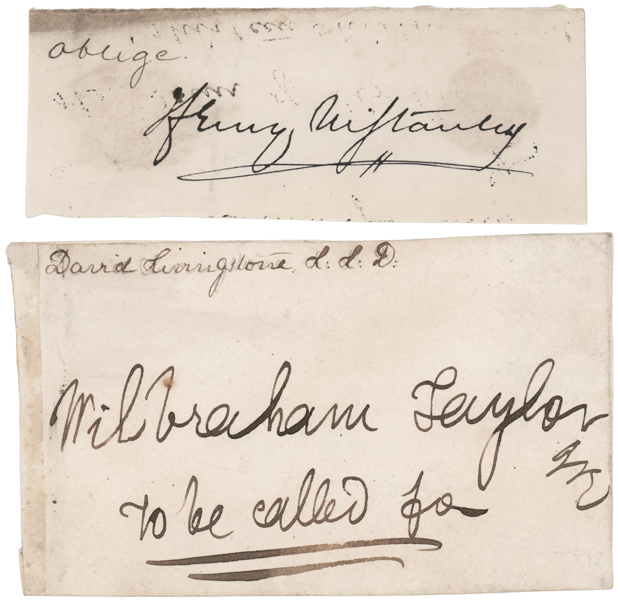 Two items: ink signature, “Henry M. Stanley,” on an off-white 4 x 1.5 sheet; and a clipped mailing envelope panel hand-addressed by David Livingstone, who writes: “Wilbraham Taylor, Esq., to be called for.” An unknown hand has added Livingstone’s name above. In overall very good to fine condition, with some light staining and toning.
