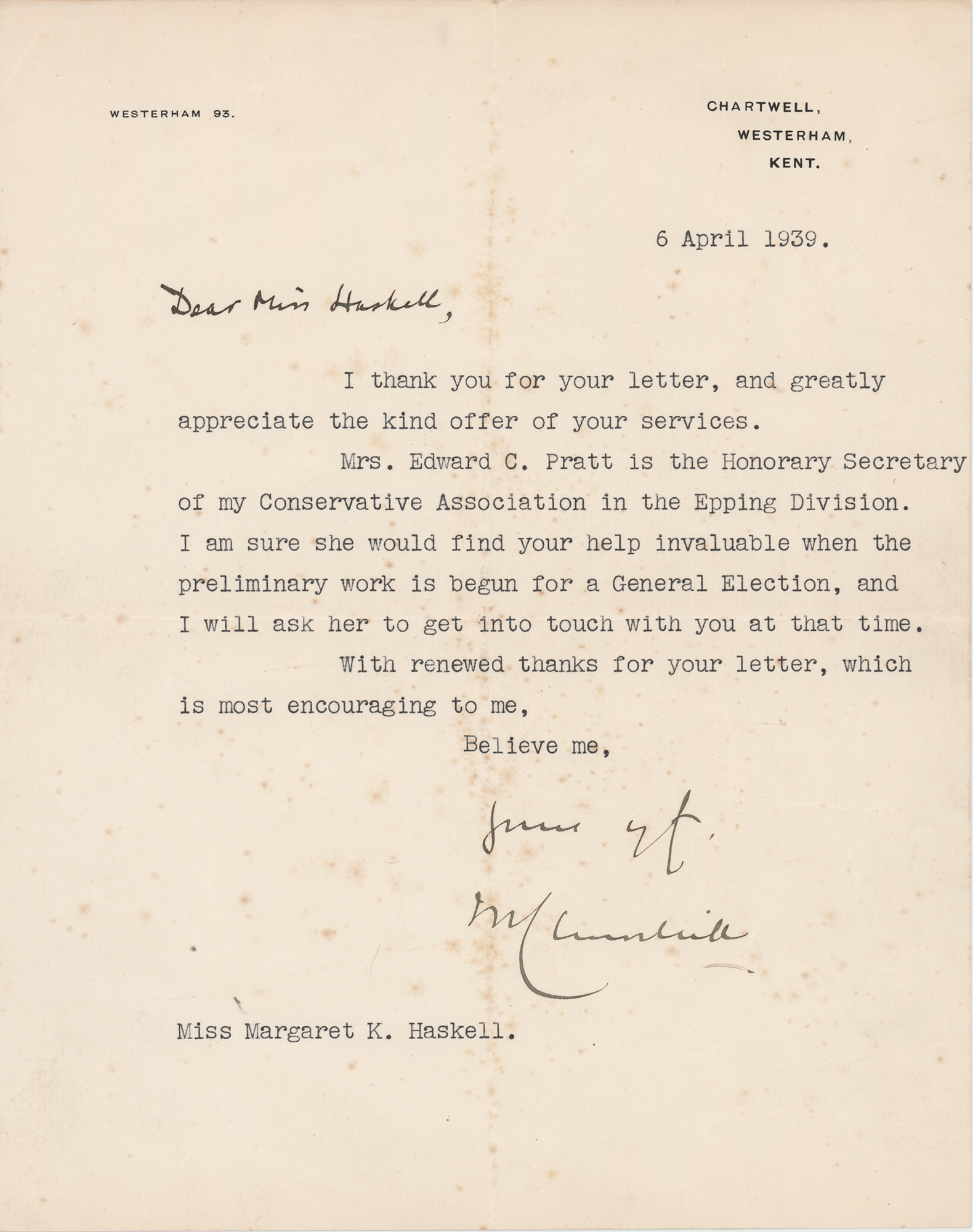 TLS signed “W. S. Churchill,” one page, 8 x 10, Chartwell, Westerham, Kent letterhead, April 6, 1939. Letter to Margaret K. Haskell, in full: “I thank you for your letter, and greatly appreciate the kind offer of your services. Mrs. Edward C. Pratt is the Honorary Secretary of my Conservative Association in the Epping Division. I am sure she would find your help invaluable when the preliminary work is begun for a General Election, and I will ask her to get into touch with you at that time. With renewed thanks for your letter, which is most encouraging to me.” In very good to fine condition, with scattered light foxing.