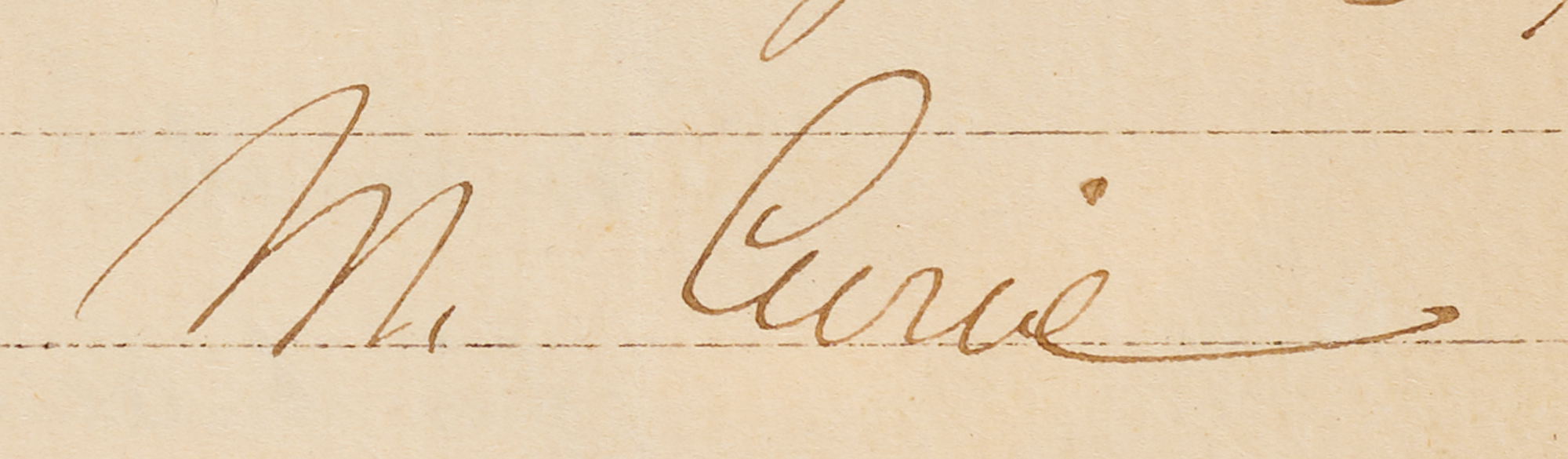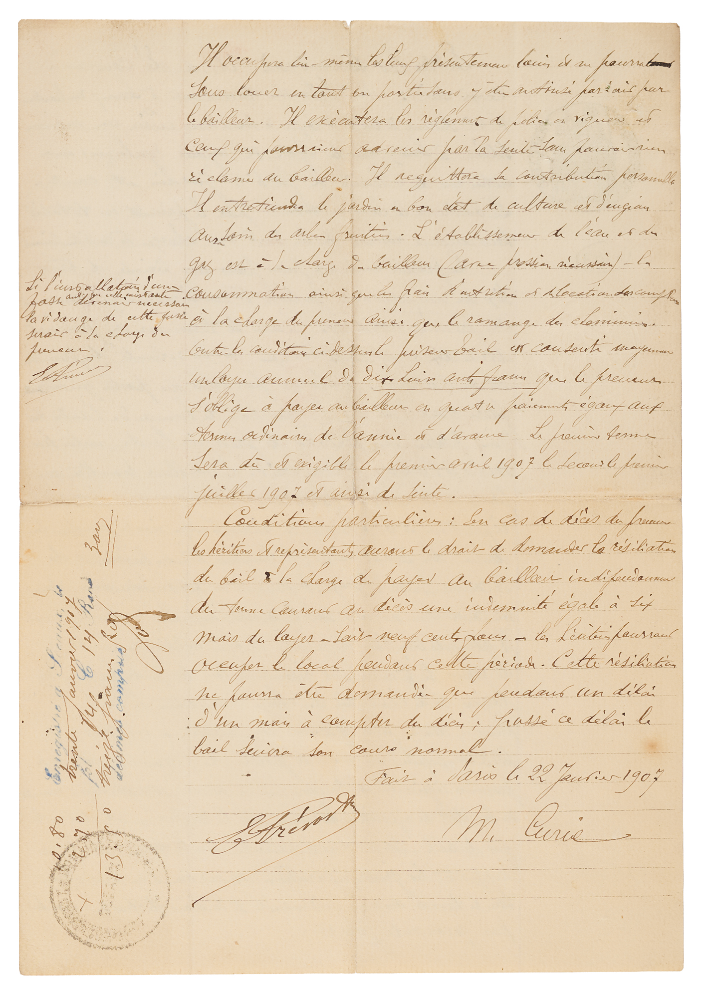Polish-born French physicist (1867–1934), she and her husband Pierre discovered two new elements, polonium and radium, in 1898. In 1911 she won the Nobel Prize for Chemistry. She died of leukemia brought about by her work with radioactive material. Manuscript DS in French, signed “M. Curie,” one page both sides, 6.75 x 9.75, January 22, 1907. Document pertaining to the lease of a property. In full (translated): "Between the undersigned, it has been agreed as follows: