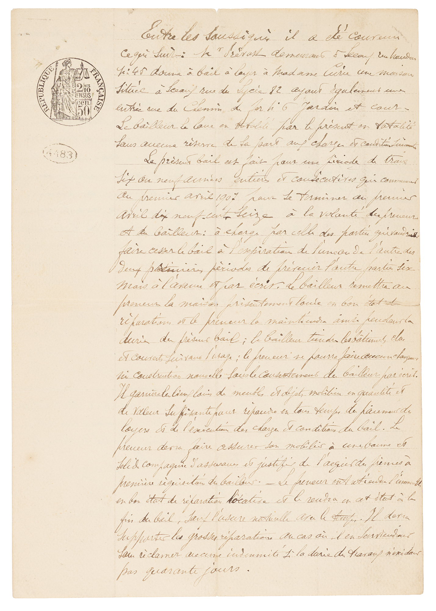Particular condition: In the event of the lessee’s death, his heirs and representatives will have the right to a cancellation of the lease in exchange for paying to the lessor, independent of the lease period at the time of death, an indemnity equal to six months of rent—that is, nine hundred francs. The heirs may occupy the premises during this period. This cancellation may be requested only within a term of one month after the death; after that term, the lease will continue its normal course." In fine condition.