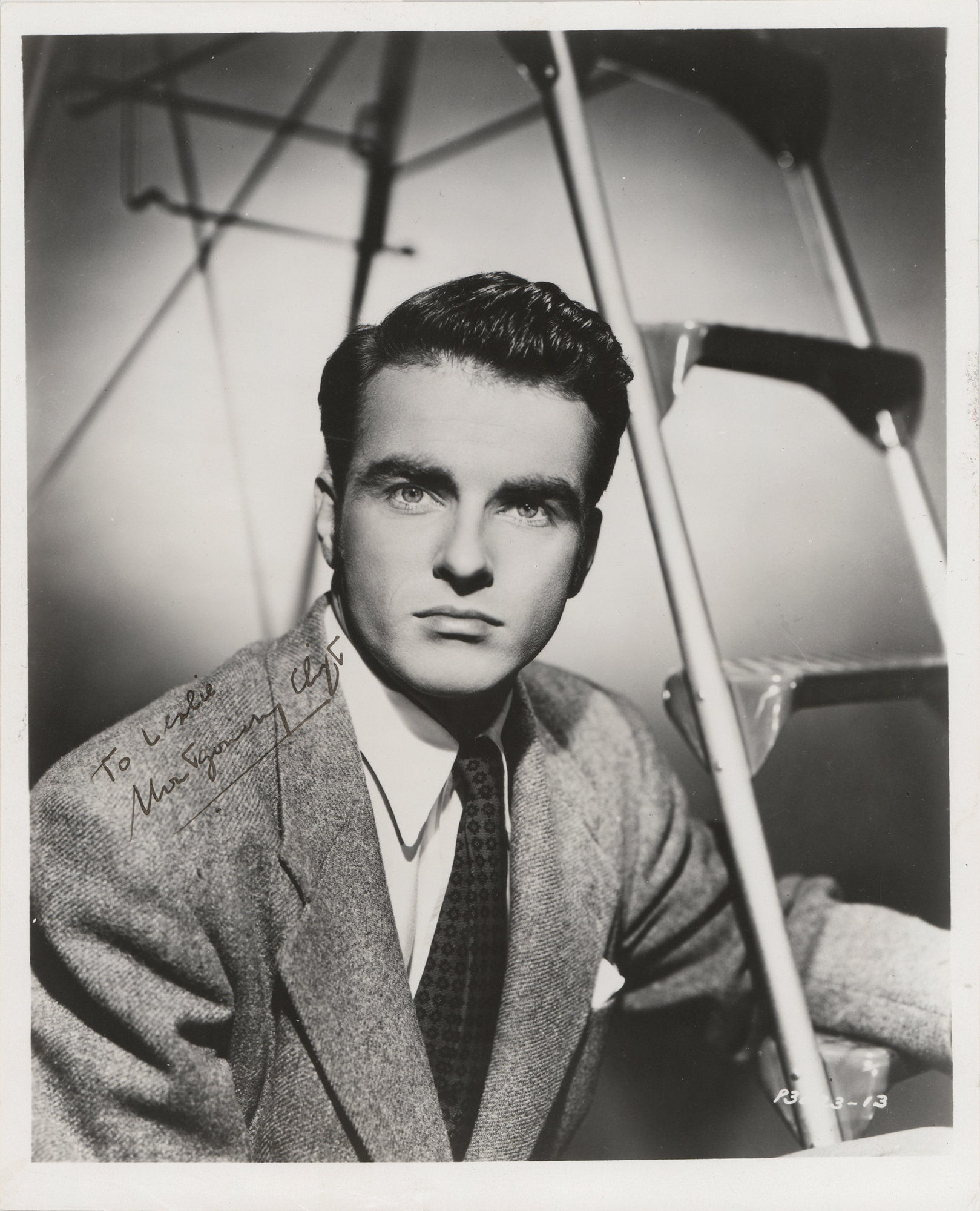 Vintage circa 1950 glossy 8 x 10 studio portrait photo of Montgomery Clift posing under a ladder, signed and inscribed in bold fountain pen, "To Leslie, Montgomery Clift.” In fine condition.