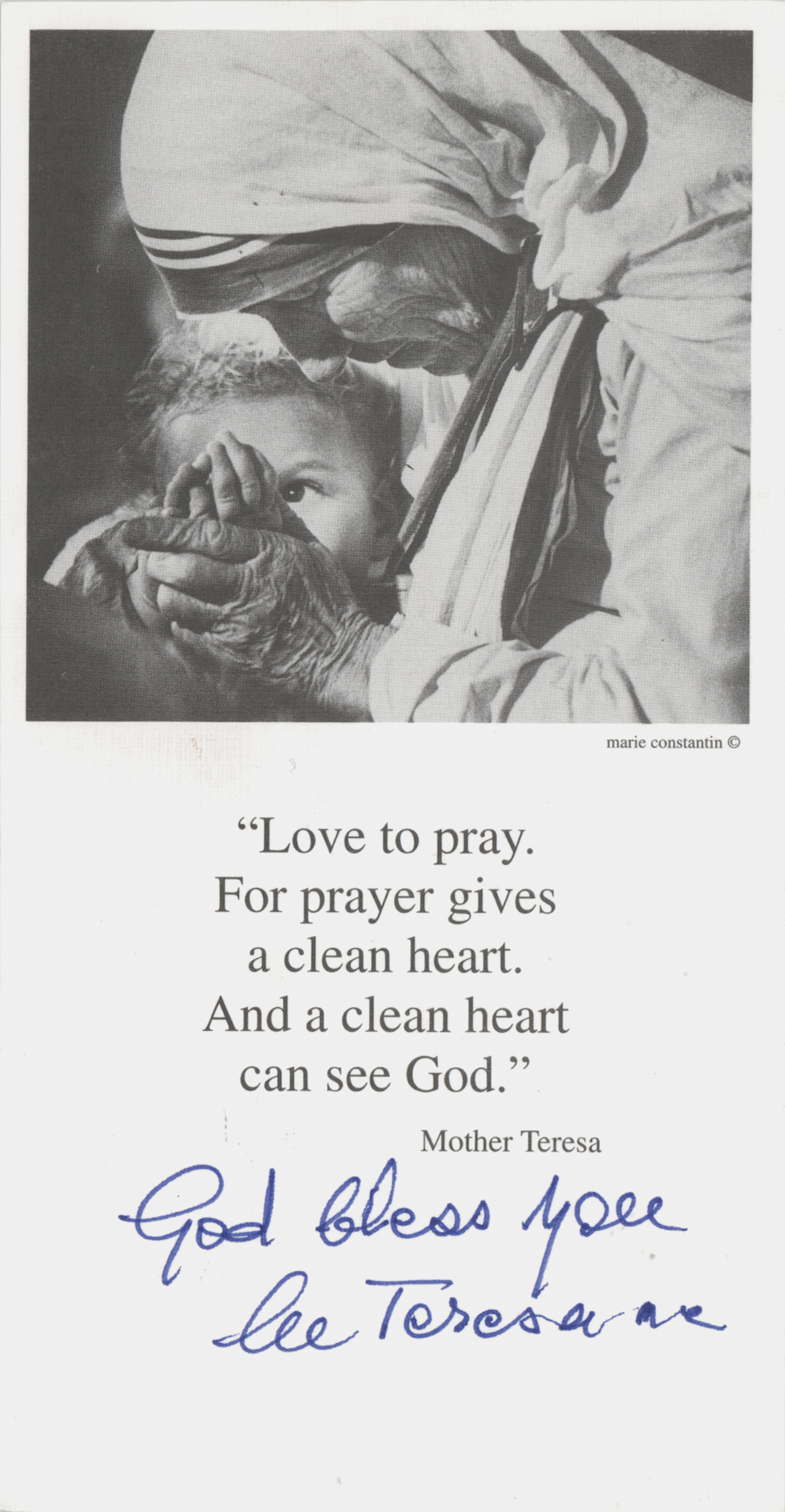 Prayer slip featuring an image of Mother Teresa holding the hand of a small child, 3 x 6, signed at the bottom in blue ink, "God bless you, M Teresa mc." In very fine condition.