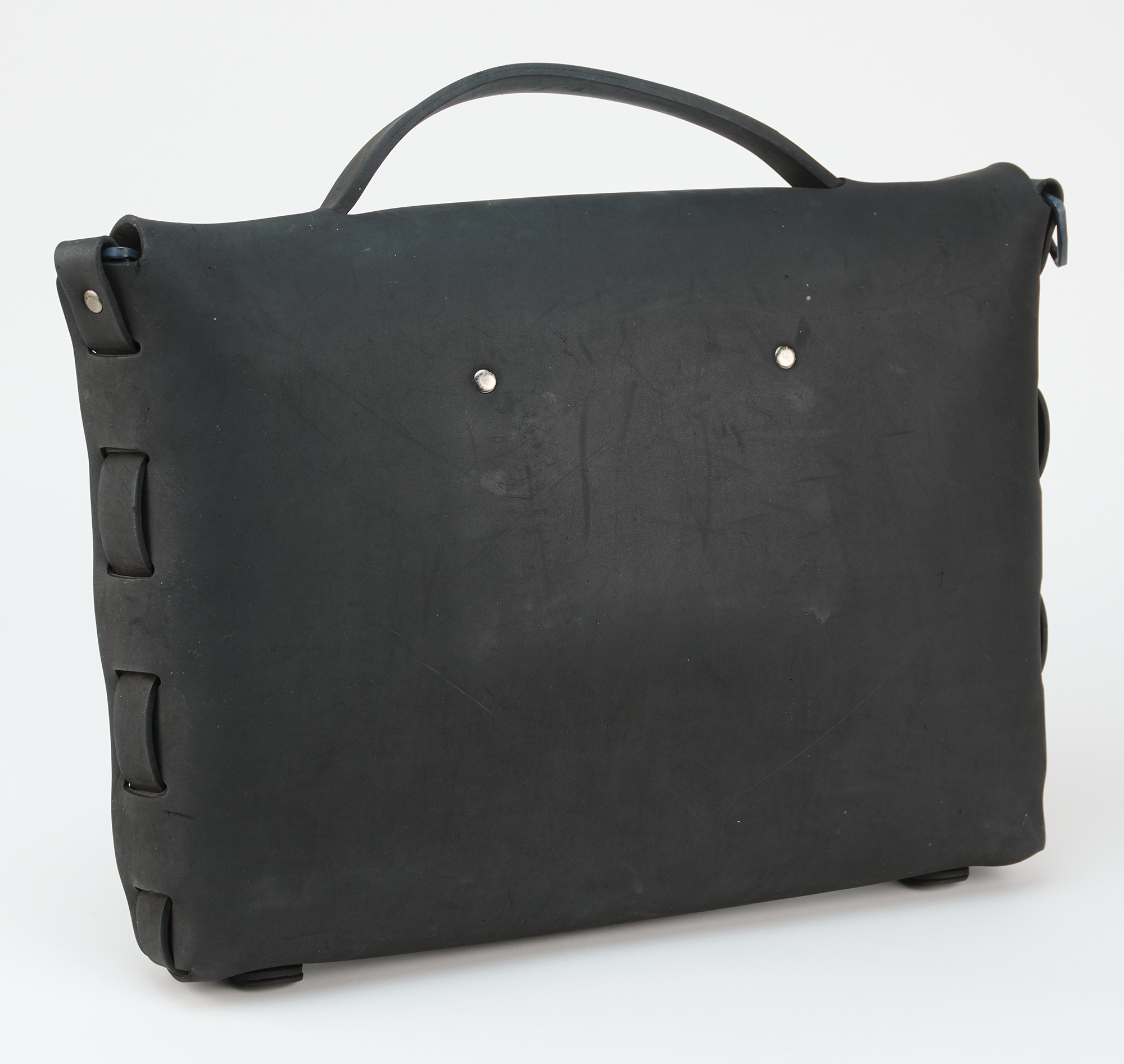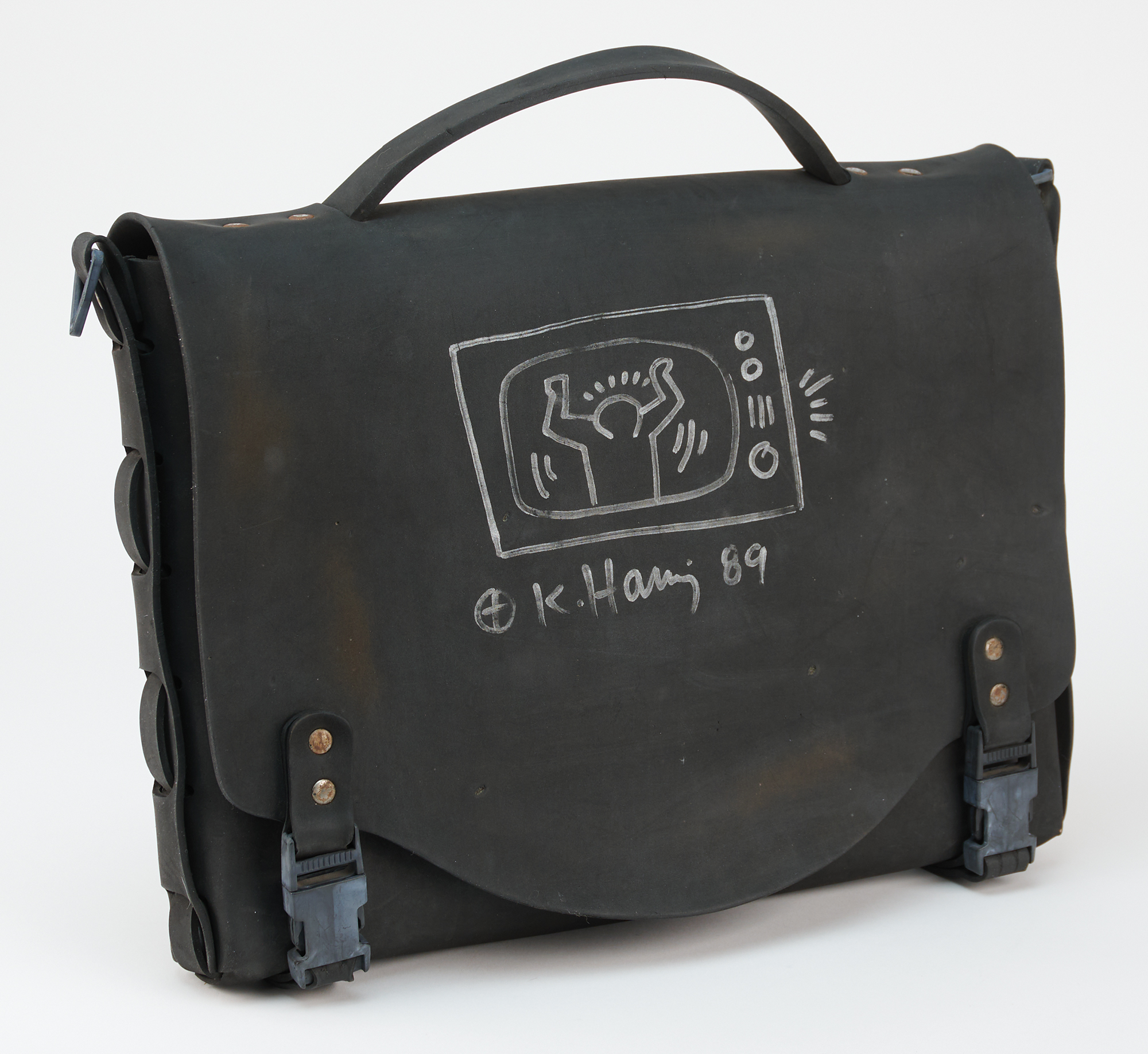 Black messenger bag made of a rubberized TPU fabric, 17˝ x 12˝ x 3.5˝, signed on the front flap in silver ink, “K. Haring, 89,” who adds his circle-cross symbol and a large sketch of a television set that contains a figure with raised arms, possibly a dancer. The inside of the bag bears an ownership notation. In fine condition, with wear from use. Throughout his work, Keith Haring repeatedly employed television imagery as a central motif, using it to critique media saturation, suggest themes of mind control, and highlight the growing influence of technology on modern society.