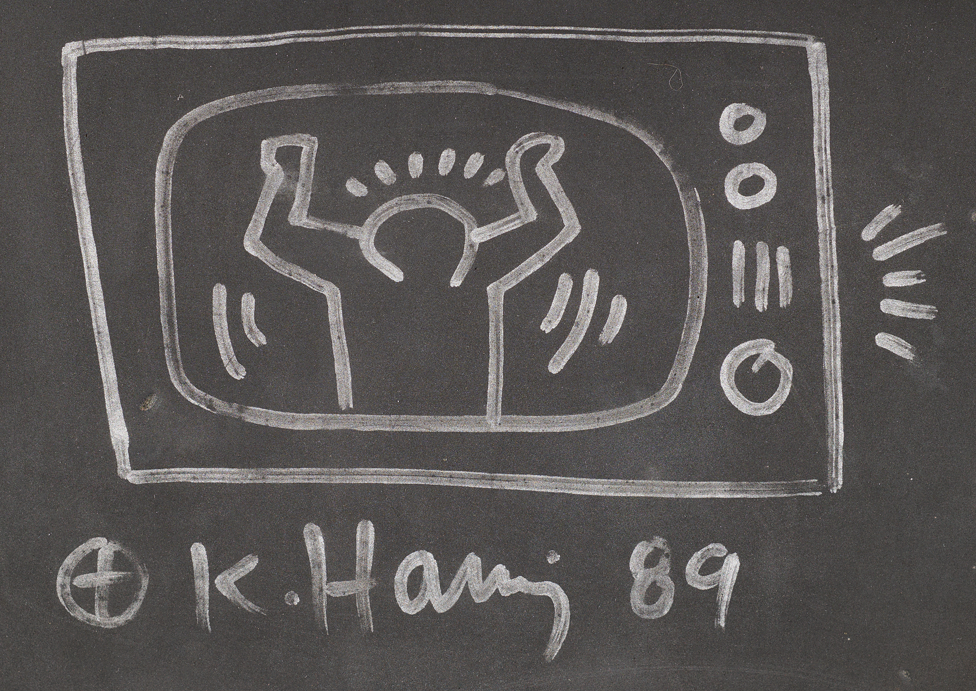 Large original Keith Haring sketch of a television set with a dancing figure, obtained at Brooklyn’s Pratt Institute in 1989
