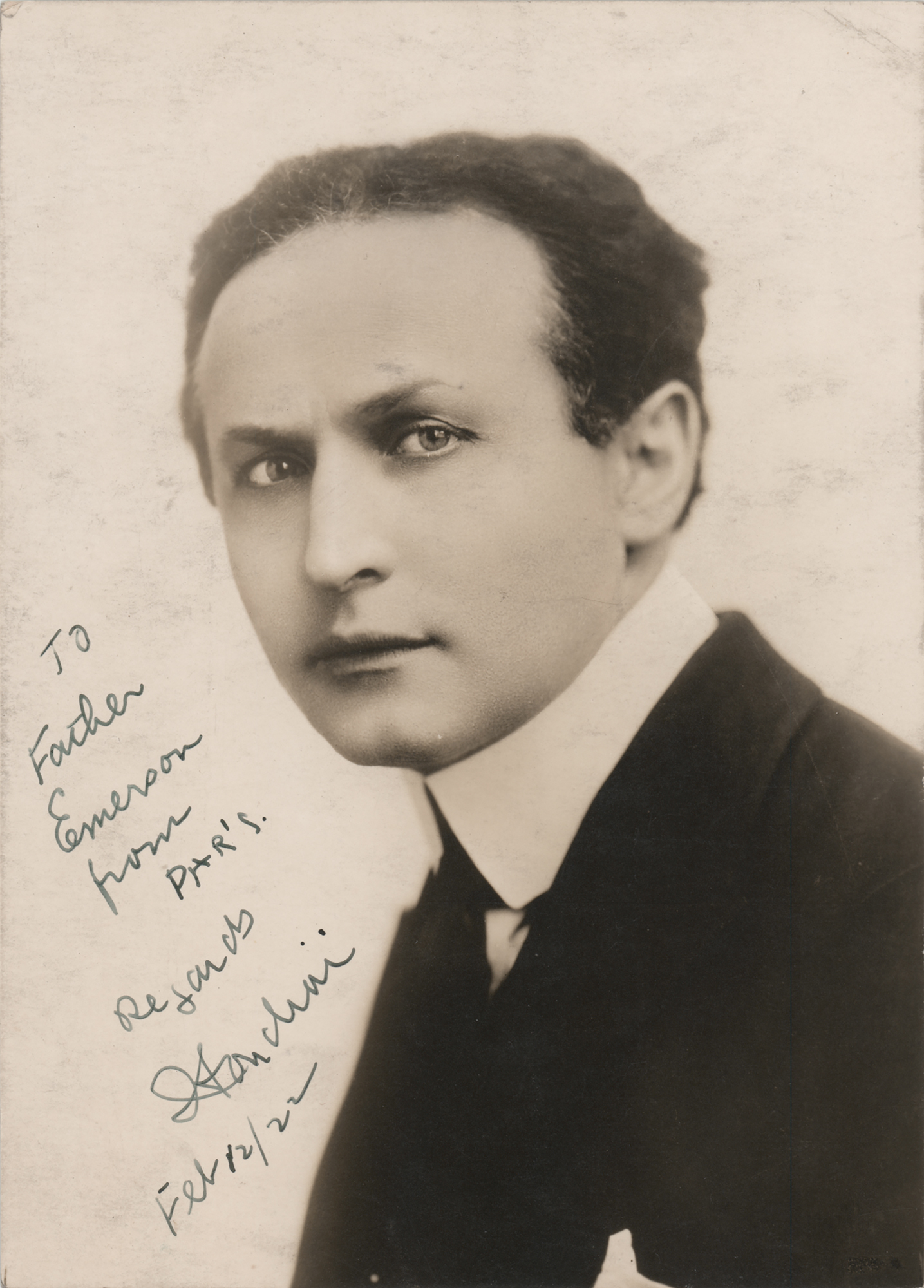 Classic vintage matte-finish 5 x 7 head-and-shoulders photo of the legendary escape artist and illusionist, signed and inscribed in fountain pen, "To Father Emerson from Paris, Regards, Houdini, Feb. 12/22." In fine condition, with a hint of faint silvering and soiling.