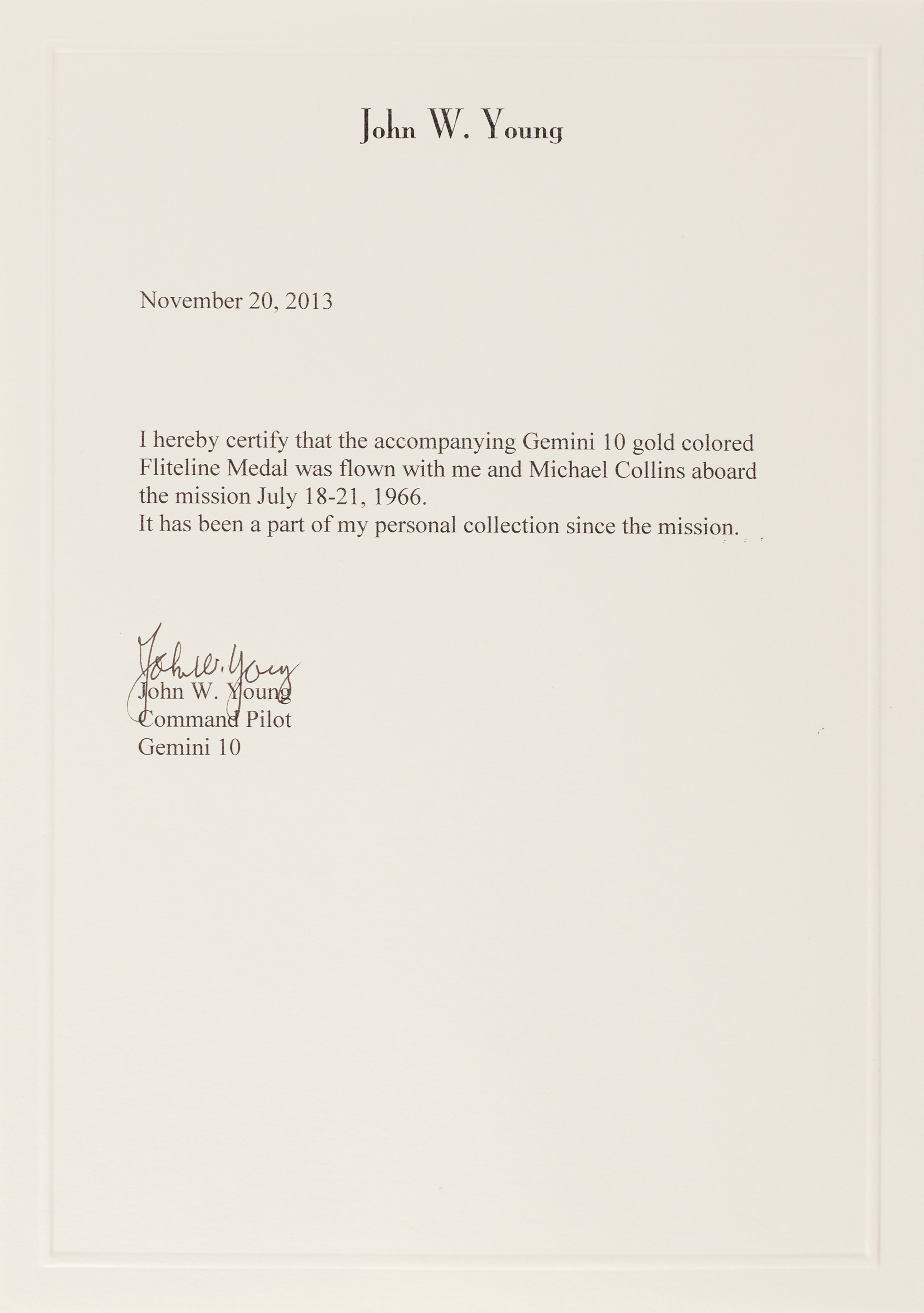 Flown gold-plated Gemini 10 Fliteline medallion, measuring 1˝ in diameter, featuring a raised design of the mission insignia on the front—a large Roman numeral "X" with Gemini and Agena spacecraft in orbit, with the crew's surnames above ("Young") and below ("Collins"). The reverse features the mission name and engraved dates, "Gemini 10, July 18–21, 1966." Encapsulated and graded by NGC as "MS 61." Accompanied by a certificate of authenticity signed by John Young, in part: "I hereby certify that the accompanying Gemini 10 gold colored Fliteline Medal was flown with me and Michael Collins aboard the mission July 18–21, 1966. It has been a part of my personal collection since the mission."