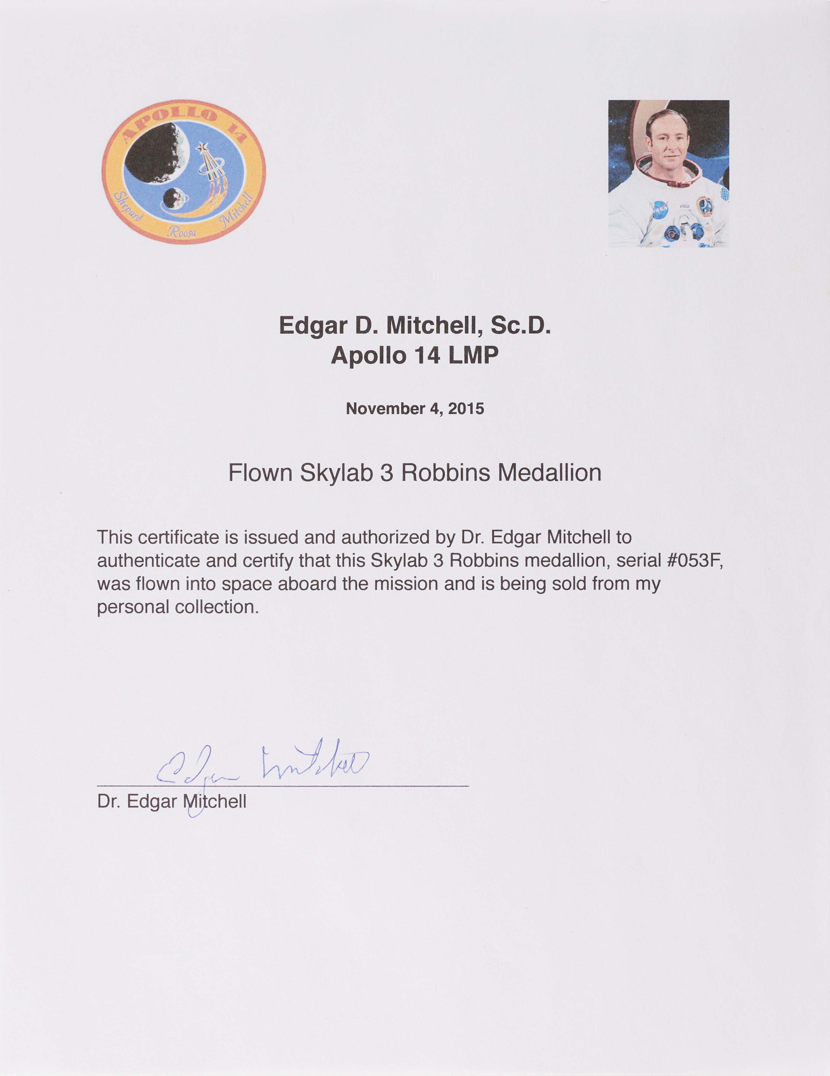 Flown sterling silver Skylab 3 (SLM-2) Robbins medallions, approximately 1.5˝ diameter, with a raised mission insignia design on the face—an image of Leonardo da Vinci's Vitruvian Man superimposed on a globe that is half Earth and half Sun. The reverse depicts the Skylab space station, engraved with launch and landing dates representing July 28, 1973 and September 25, 1973. Serial numbered “053F” on the edge, and stamped with the Robbins "Sterling" hallmark. Condition is mint state. Accompanied by its original case and a letter of authenticity signed by Edgar Mitchell, certifying that "this Skylab 3 Robbins medallion, serial #053F, was flown into space aboard the mission and is…from my personal collection."