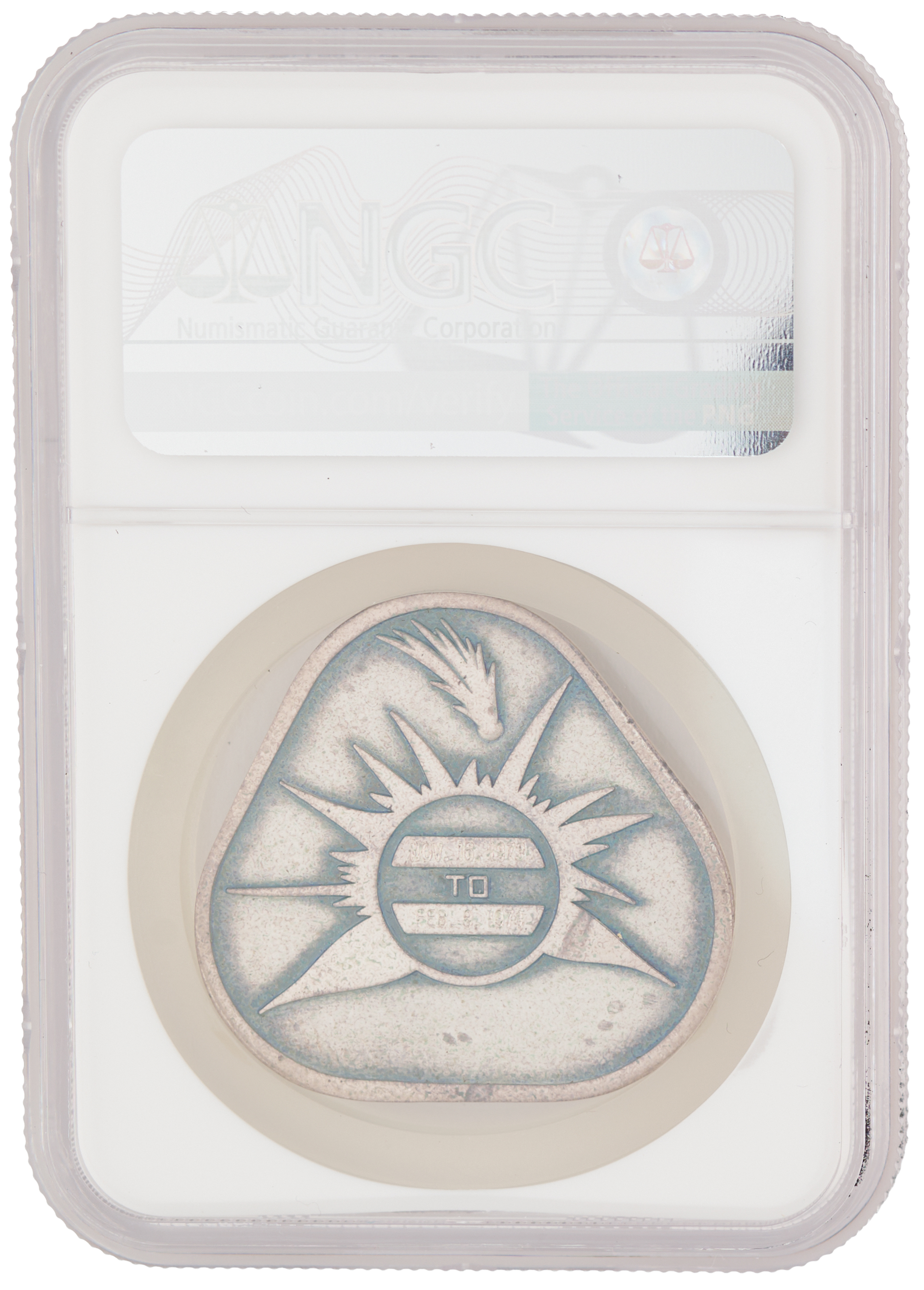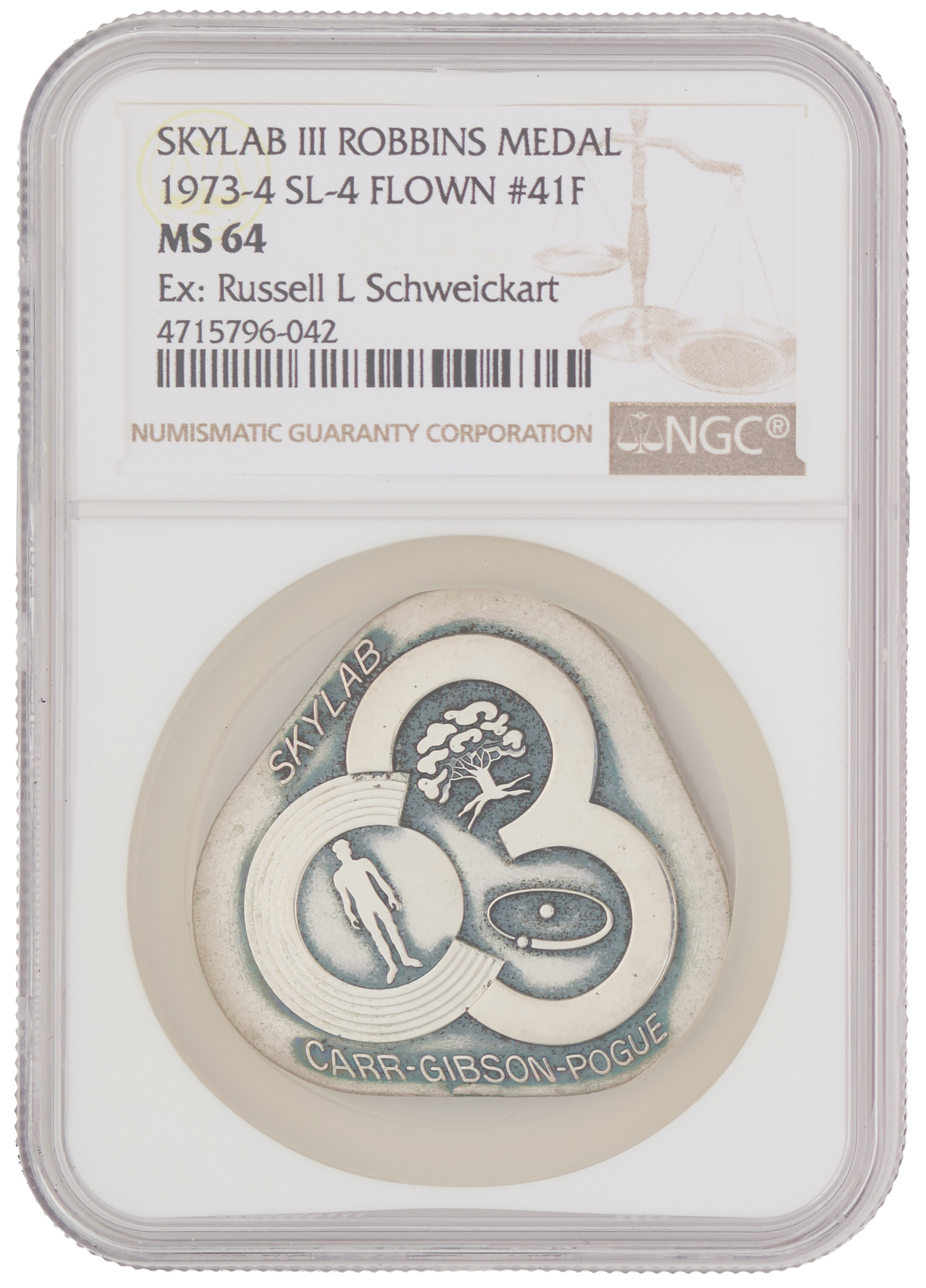 Flown sterling silver Skylab 4 (SLM-3) Robbins medallion, measuring approximately 1.5˝ x 1.25˝, featuring a raised design of the mission insignia on the face—an emblem incorporating imagery of a man, tree, and hydrogen atom. The reverse engraved with the mission's launch date of November 16, 1973, and the landing date of February 8, 1974. Serial numbered “41F” on the edge. Encapsulated and graded by NGC as "MS 64," with the label noting the provenance, "Ex. Russell L. Schweickart." Accompanied by a certificate of authenticity signed by Rusty Schweickart, certifying that "silver Skylab 4 Robbins Medallion, serial #41F, was flown aboard Skylab 4…and has been in my personal collection since the mission." A scarce and attractive example, as only 70 Robbins medallions flew on this mission.