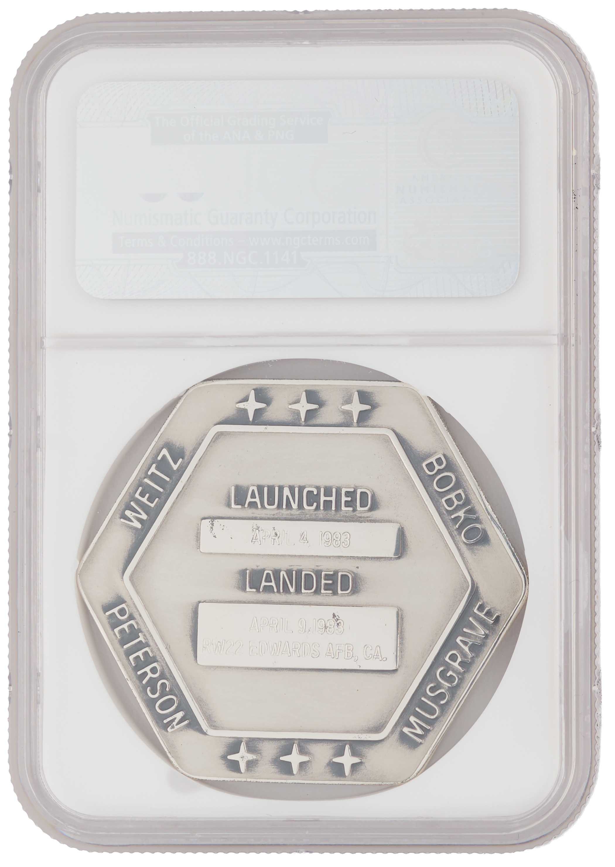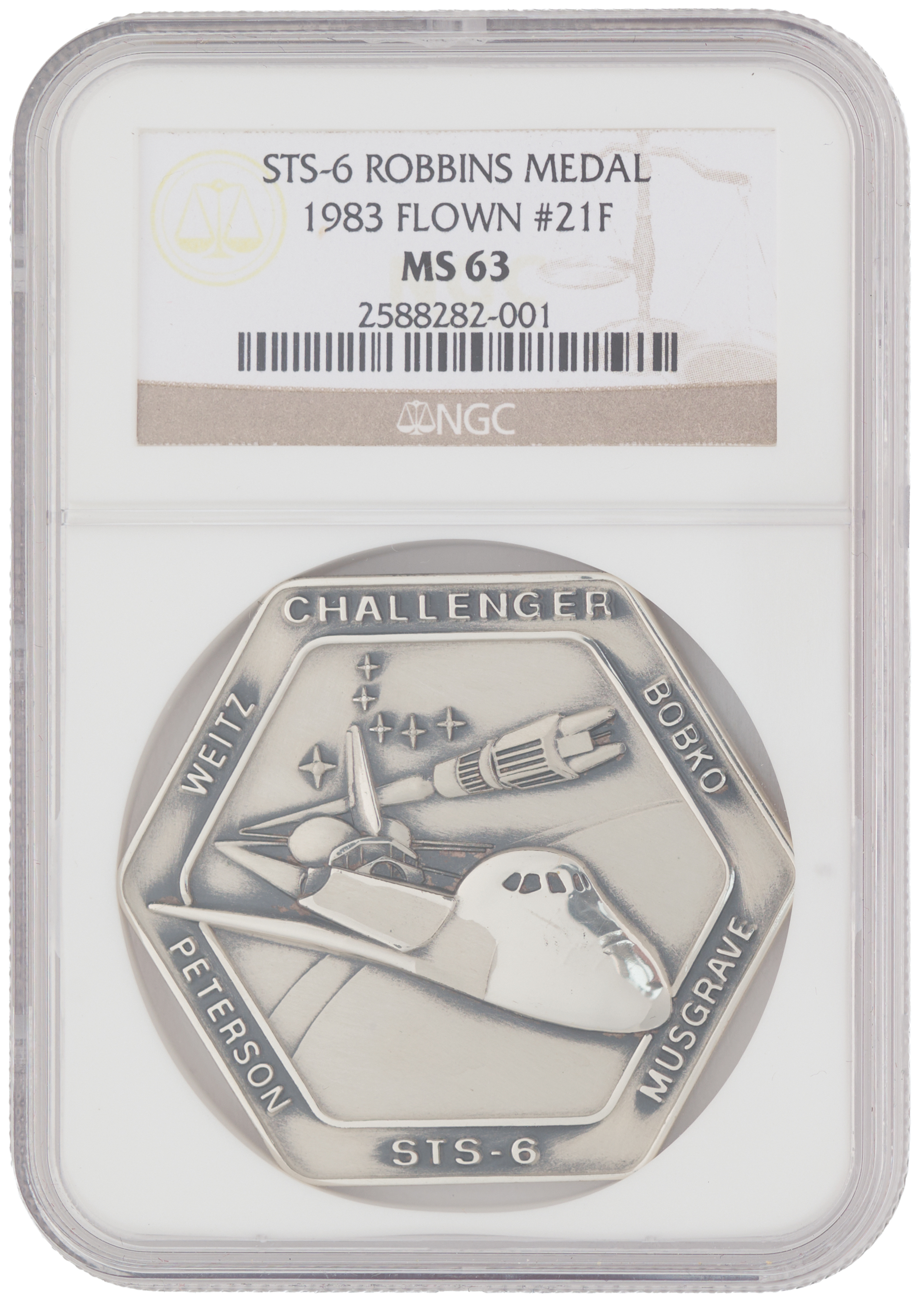 Flown sterling silver STS-6 Robbins medallion, measuring approximately 1.75″ x 1.5″, with a raised mission insignia design on the face—an emblem commemorating the maiden flight of the Space Shuttle Challenger. The reverse is encircled by the names of the four astronauts and is engraved with the launch and landing dates of April 4, 1983 and April 9, 1983. The medallion is serial numbered "21F" on the edge and stamped with the Robbins "Sterling" hallmark. Encapsulated and graded by NGC as "MS 63." Accompanied by its original case. As desirable example as one of only 67 Robbins medallions that flew on this mission.