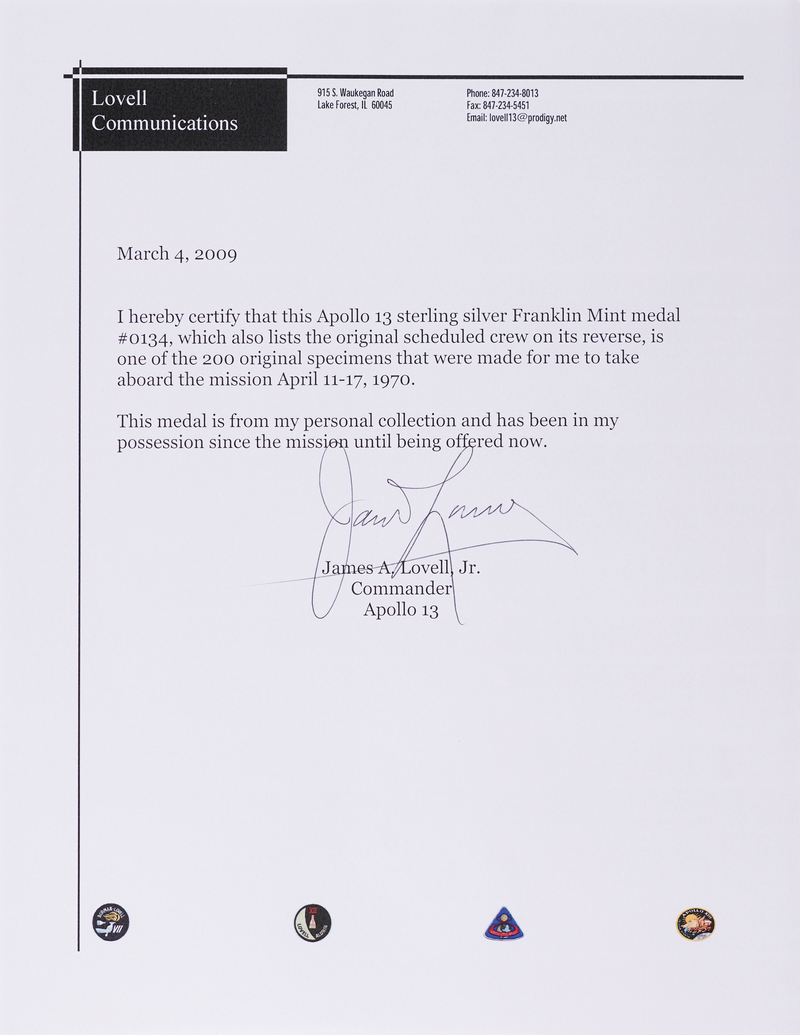 Unflown Apollo 13 sterling silver medallion struck by the Franklin Mint, approximately 1.5″ in diameter, with a raised design of the mission insignia on the face and depictions of the Odyssey and Aquarius spacecraft encircled by the original astronauts’ names on the reverse. The medal is serial numbered “0134.” Encapsulated and graded by NGC as "MS 64," with the label noting the provenance, "Ex. James A. Lovell, Jr."; it erroneously denotes the medal as flown. Accompanied by a signed letter of provenance from the Apollo 13 Commander, in part: “I hereby certify that this Apollo 13 sterling silver Franklin Mint medal #0134…is one of the 200 original specimens that were made for me to take aboard the mission…This medal is from my personal collection and has been in my possession since the mission.”