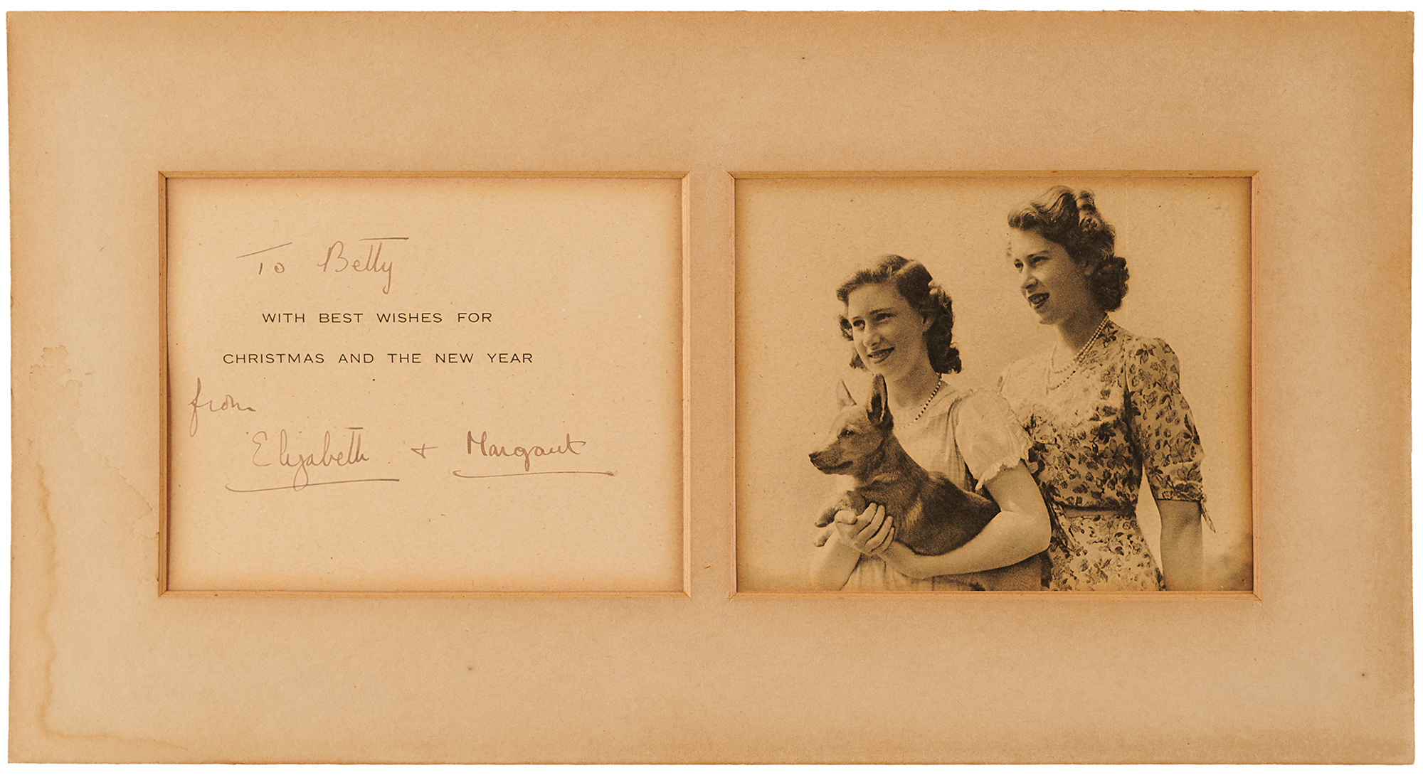 Vintage circa 1940s Christmas card depicting the young Princess Elizabeth and Princess Margaret with a beloved corgi, measuring 11.75 x 5 open, signed and inscribed around the printed greeting in fountain pen, "To Betty, from Elizabeth" and "Margaret." Matted to an overall size of 13.5 x 7. In very good to fine condition, with edge toning to the card, and toning and damstaining to the mat.