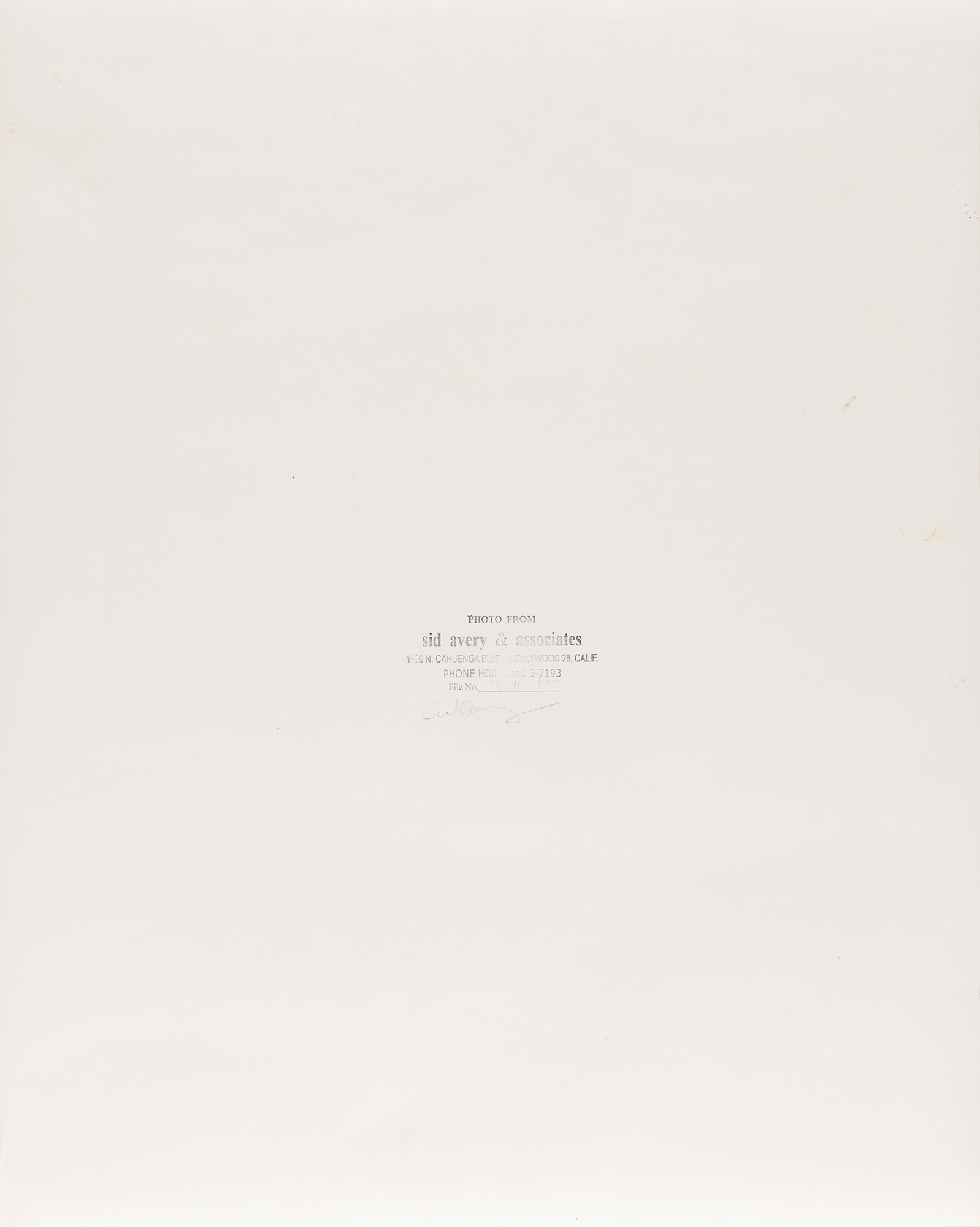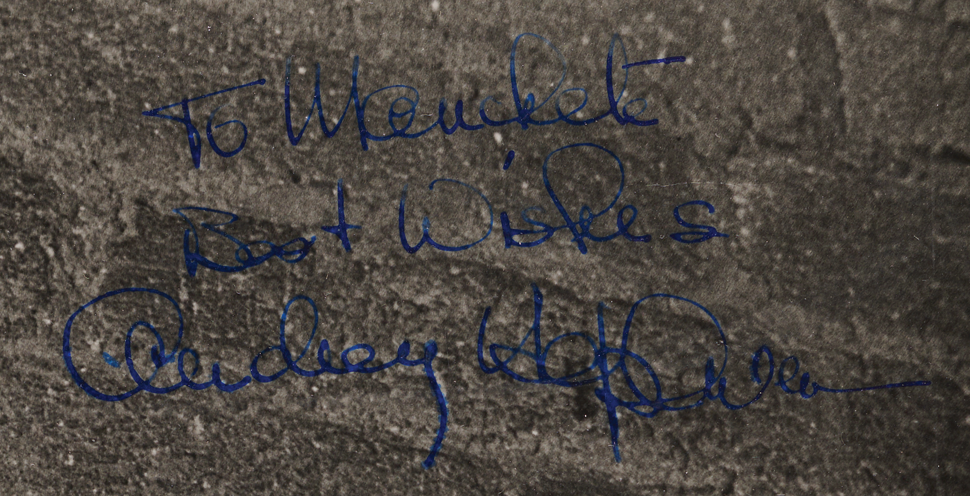 Outstanding oversized vintage semi-glossy 16 x 20 photo of Hepburn taken by Sid Avery near the Fulton Theatre in Manhattan after staging the play Gigi, signed and inscribed in fountain pen "To Manchete, Best Wishes, Audrey Hepburn.” Also signed on the reverse in pencil by photographer Sid Avery, below his "Sid Avery & Associates" credit stamp. In fine condition.