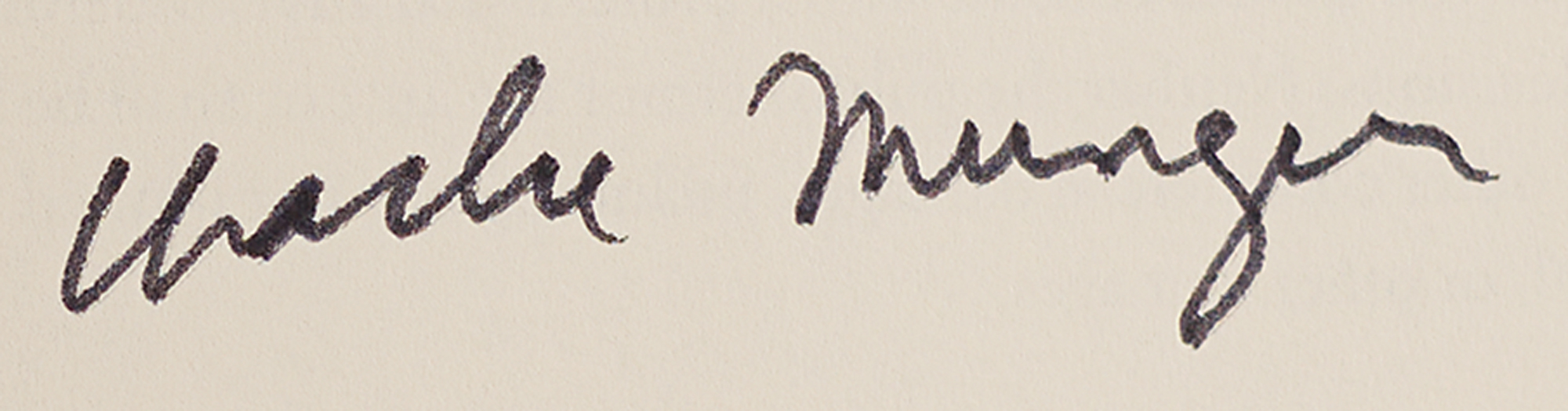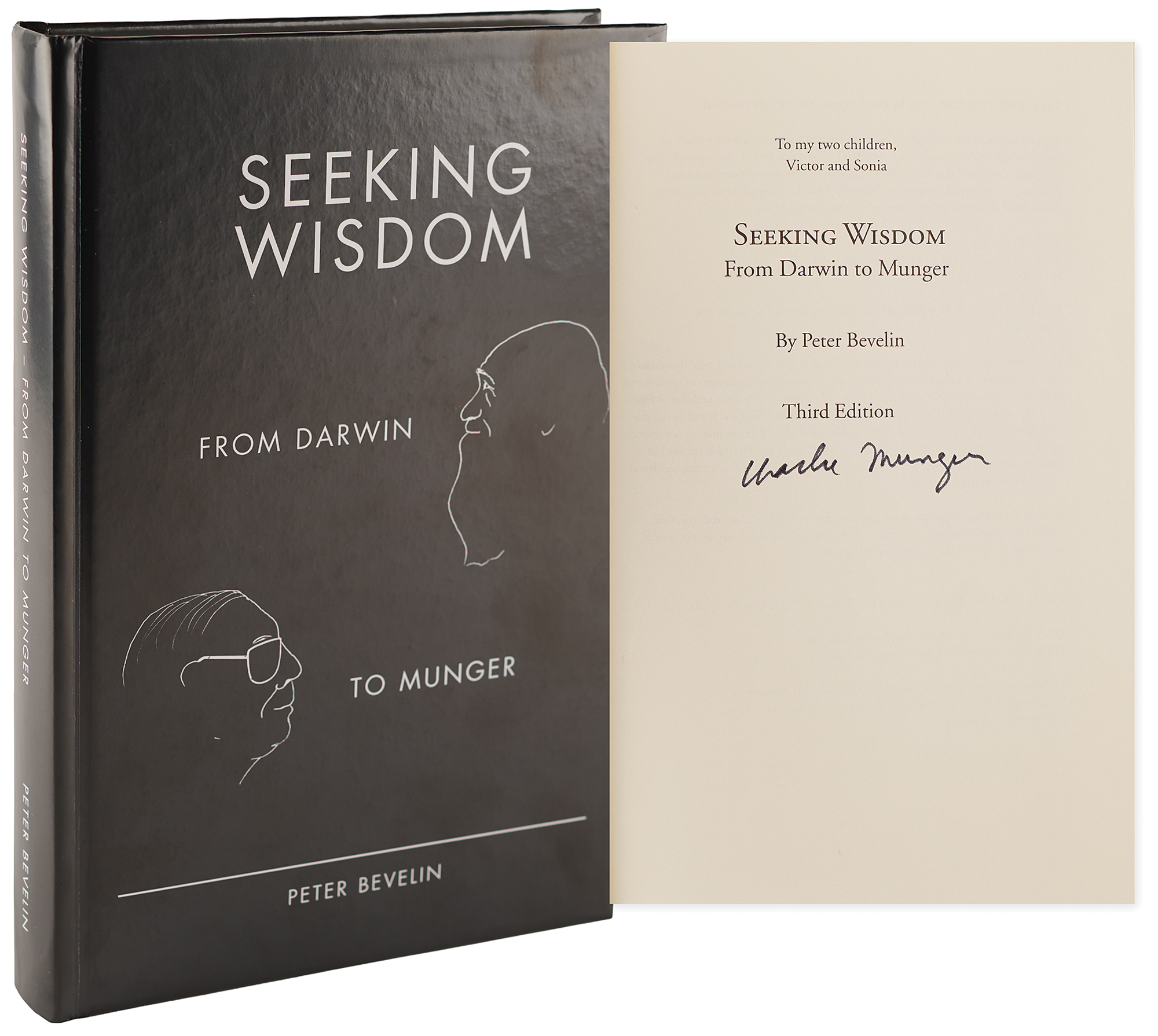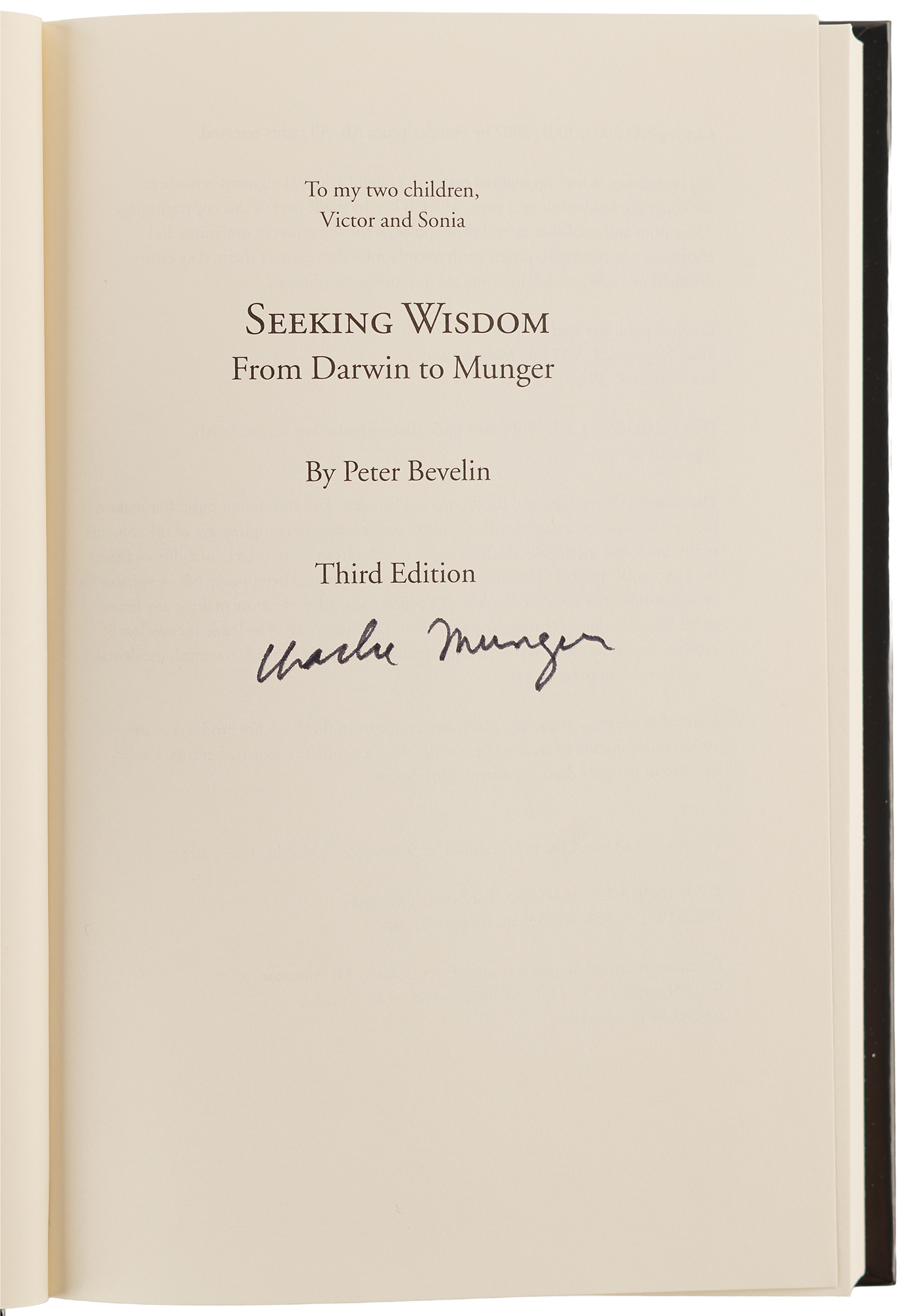 American businessman, investor, and philanthropist (1924–2023) who was vice chairman of Berkshire Hathaway. Warren Buffett described Munger as his closest partner and right-hand man, and credited him with being the ‘architect’ of modern Berkshire Hathaway's business philosophy. Signed book: Seeking Wisdom: From Darwin to Munger by Peter Bevelin. Third edition. Malmo, Sweden: Post Scriptum AB, 2007. Hardcover, 6.5 x 9.75, 318 pages. Signed on the title page in black felt tip by Munger. In very fine condition.
