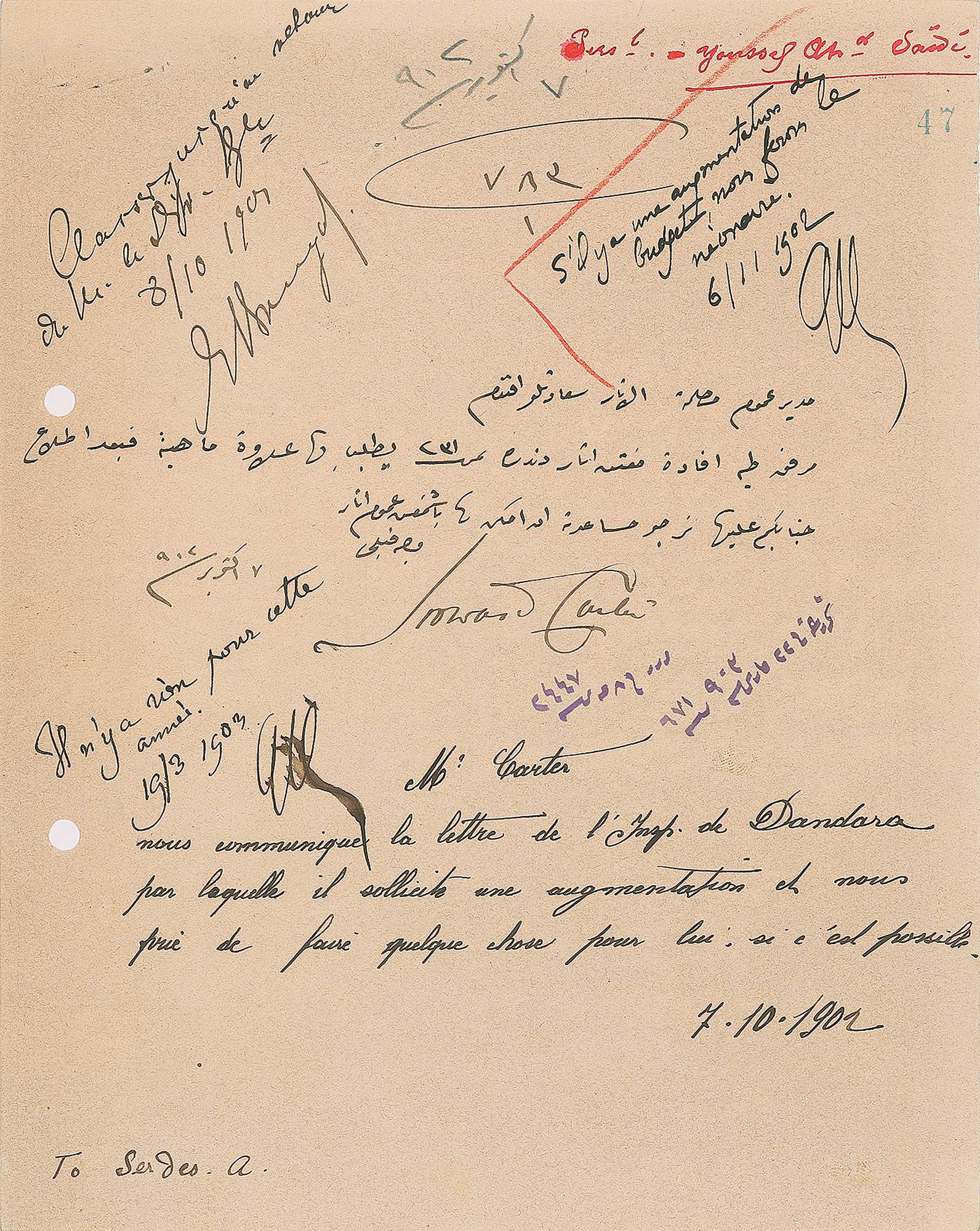British archaeologist and Egyptologist (1874–1939) known for his discovery of the tomb of Tutankhamun in Egypt's 'Valley of the Kings.' Manuscript DS, one page, 7 x 9, 1902. Document concerning a pay raise for a tomb guard, signed by Carter to approve the request. Also initialed twice by prominent Egyptologist Gaston Maspero. In fine condition, with pin holes to upper left corner and two file holes along the left edge.