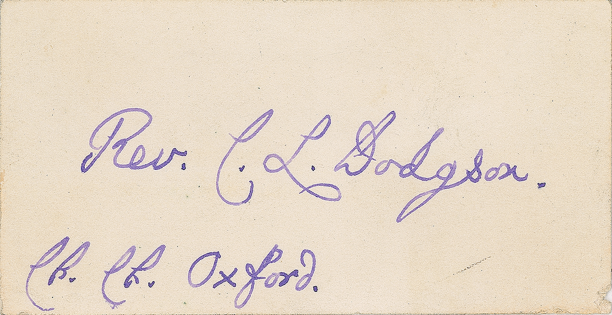 British author, mathematician, and photographer (1832–1898) who, under the pen name Lewis Carroll, published Alice's Adventures in Wonderland and its sequel, Through the Looking-Glass, two of the most popular and durable classics in the canon of children's literature. Attractive purple ink signature, "Rev. C. L. Dodgson, Ch. Ch. Oxford,” on an off-white 3 x 1.5 card. In fine condition.