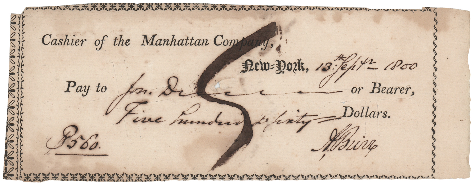Cashier of the Manhattan Company check, 7.25 x 2.75, filled out in another hand and signed by Burr, "A. Burr," payable to "Jon. D—" for $560, September 13, 1800. In fine condition, with some scattered light staining.