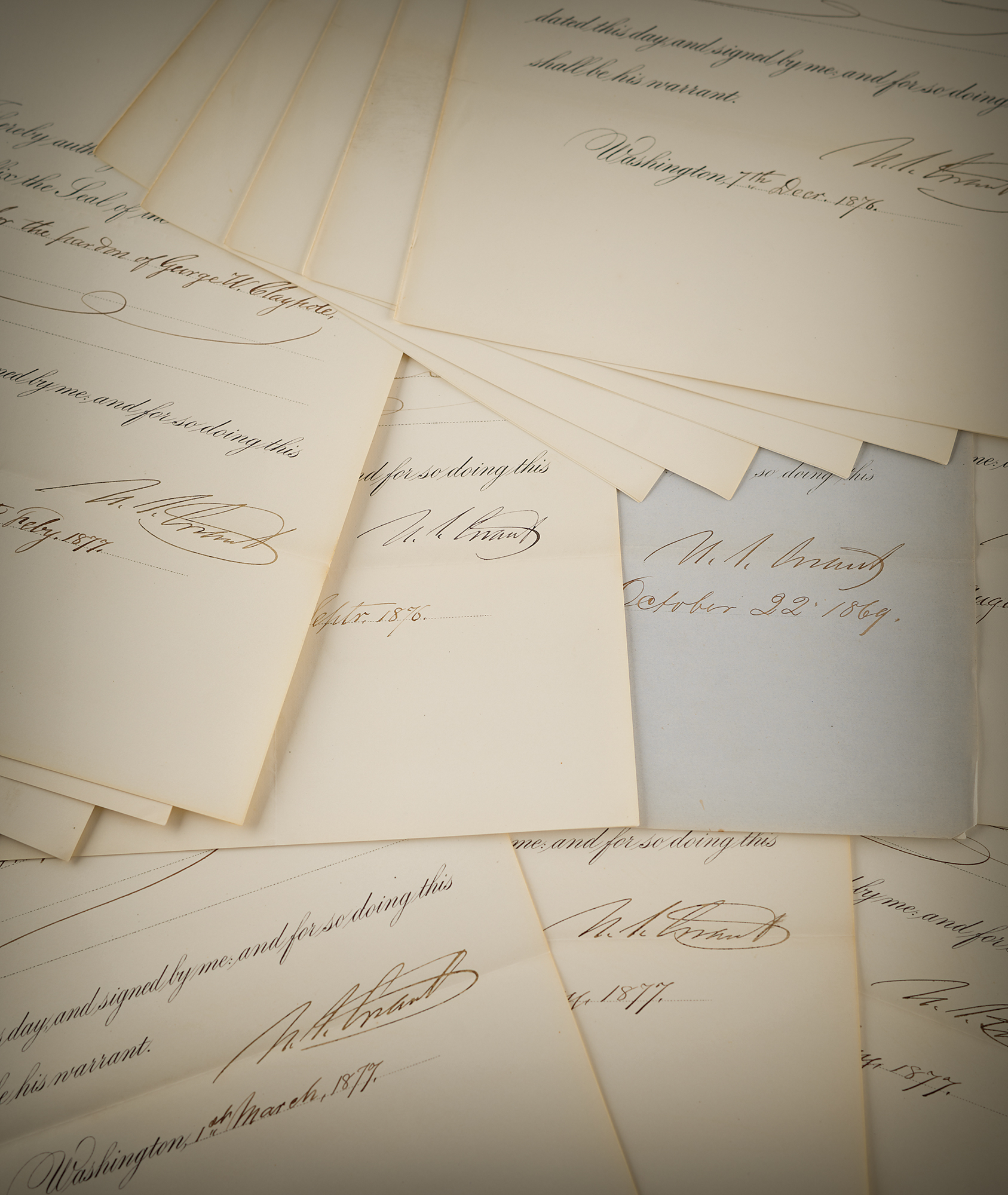 Uncommon archive of 20 partly-printed DSs as president, signed "U. S. Grant," all one page, 8 x 10, dated from October 22, 1869, to March 3, 1877. Several of these pardon warrants—signed in the waning days of Grant’s administration, which came to its end on March 4, 1877—reflect the president’s final exercise of executive authority before leaving office. In overall fine to very fine condition.