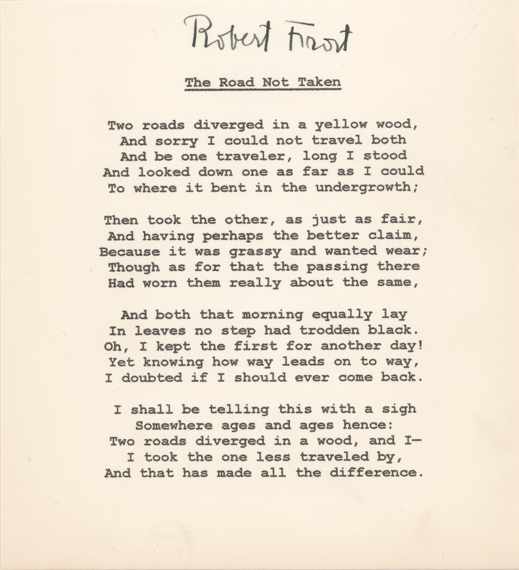 Fountain pen signature, "Robert Frost,” on an off-white 5 x 5.5 sheet imprinted with the text of his poem 'The Road Not Taken.' In very fine condition.